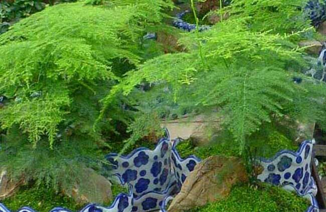 1、材料先择:高20厘米左右文竹一棵,选10厘米余高的文竹二棵,不规则形汉白玉浅盆和其配套的几架,高10厘米左右的山石若干,适量培养土和青苔。