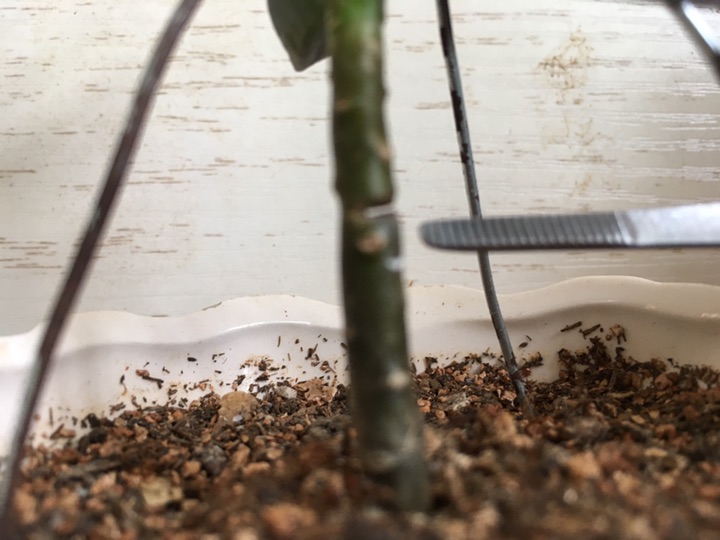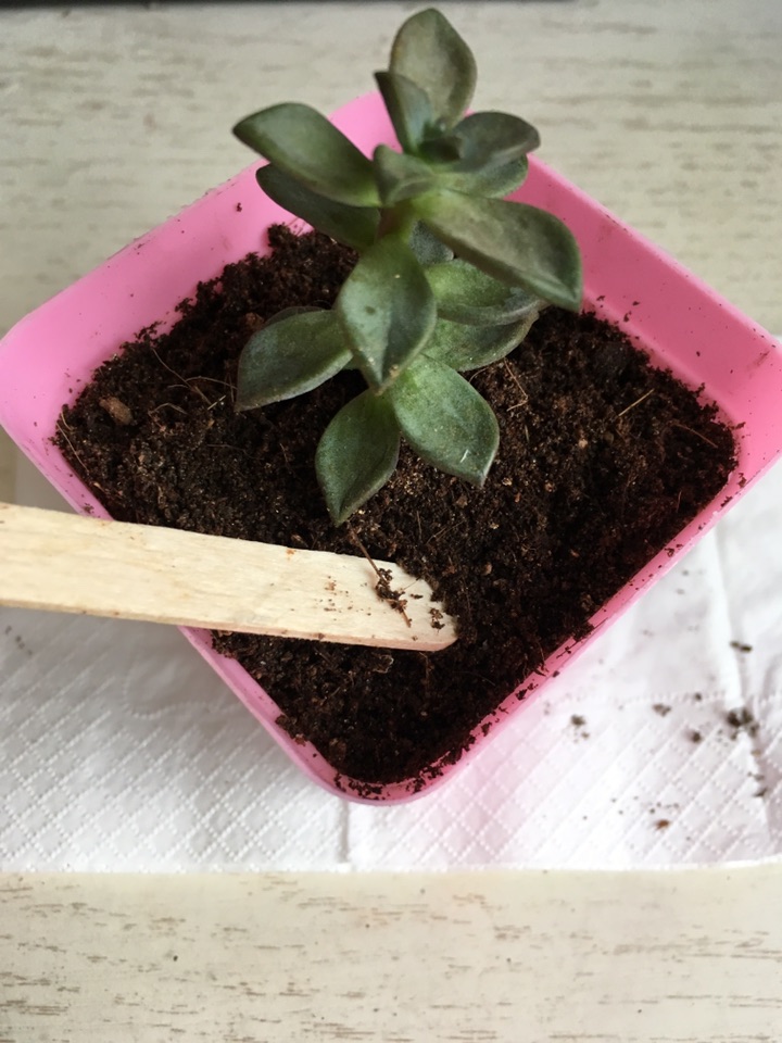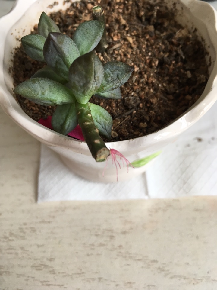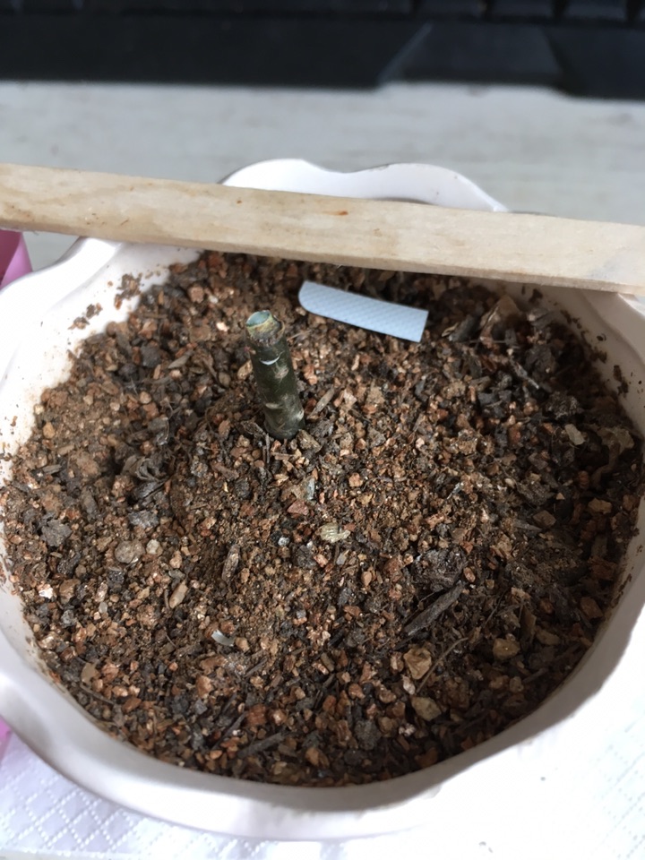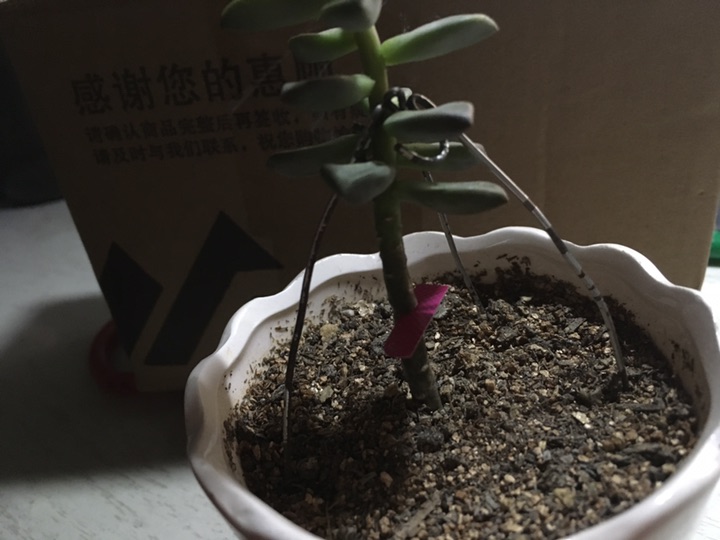 我的多肉徒长了 我决定 斩。8月5号 先用铁丝固定 腰斩一半 伤口涂抹多菌灵和生根剂溶液 并在伤口间夹一小片硬塑料片 8月8号 伤口愈合 取下塑料片 8月18号 不要伤到气根 掰断 上半部分 定植 按照以往的经验 半个月就能生根发芽 最最最希望的是 下面半截能多发芽 那就👌了......