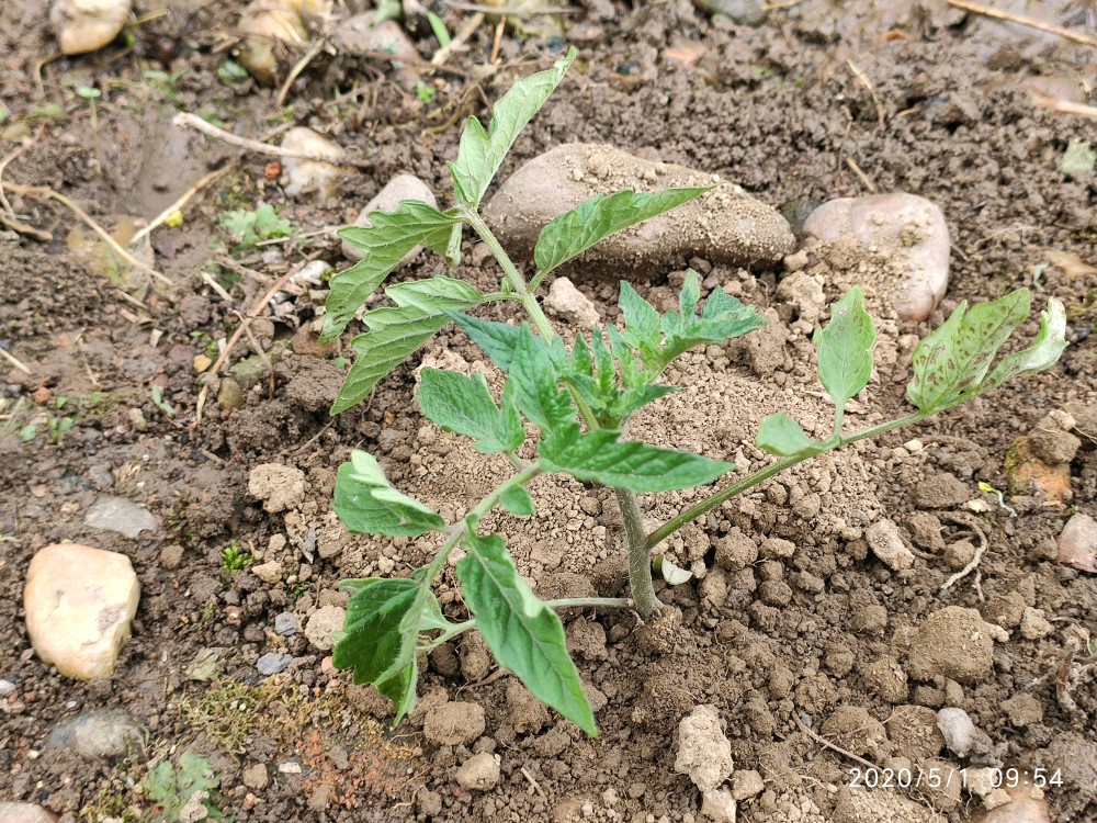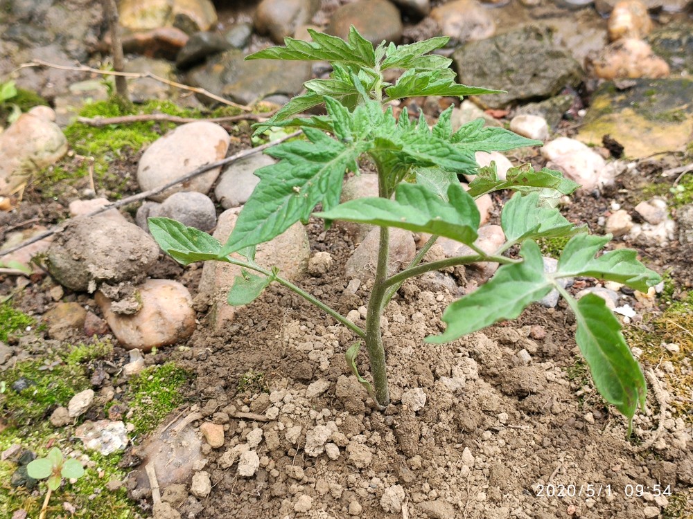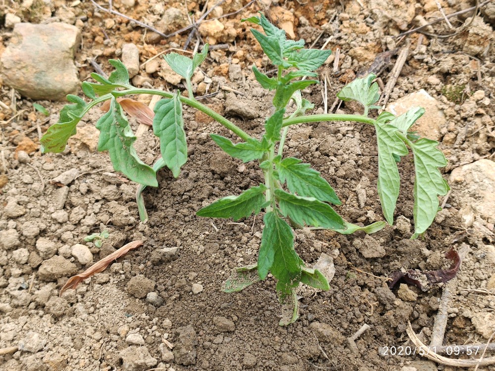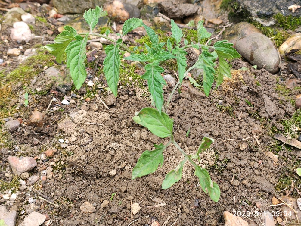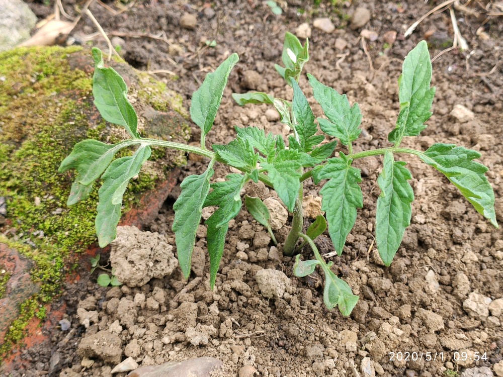 之前种的玉米死了一棵,在其位置又补过去一棵西红柿