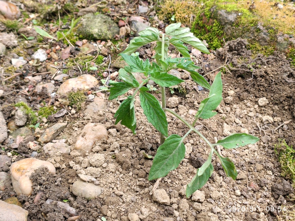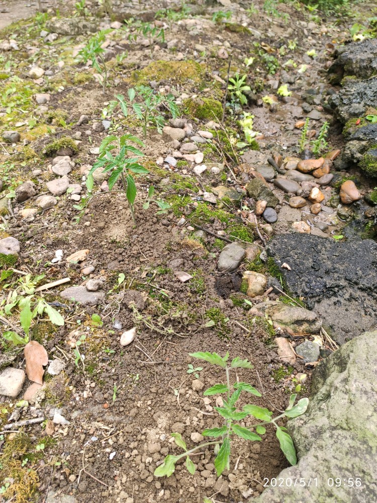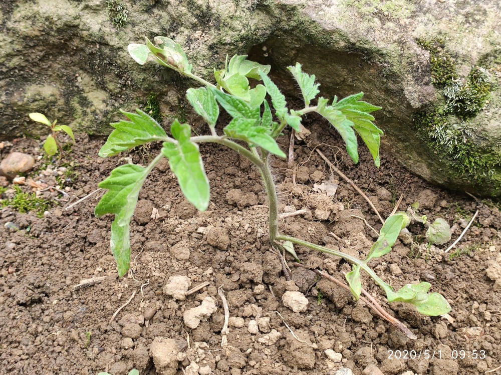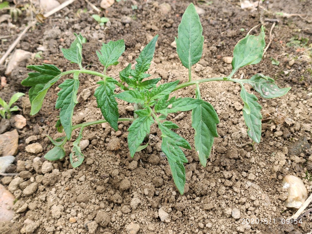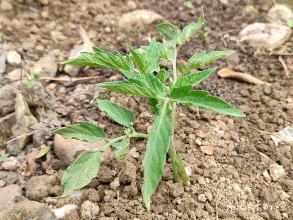 之前种的玉米死了一棵,在其位置又补过去一棵西红柿