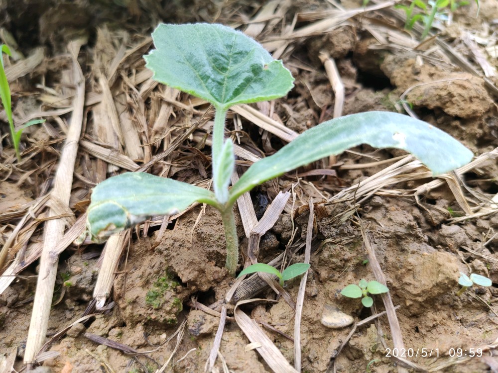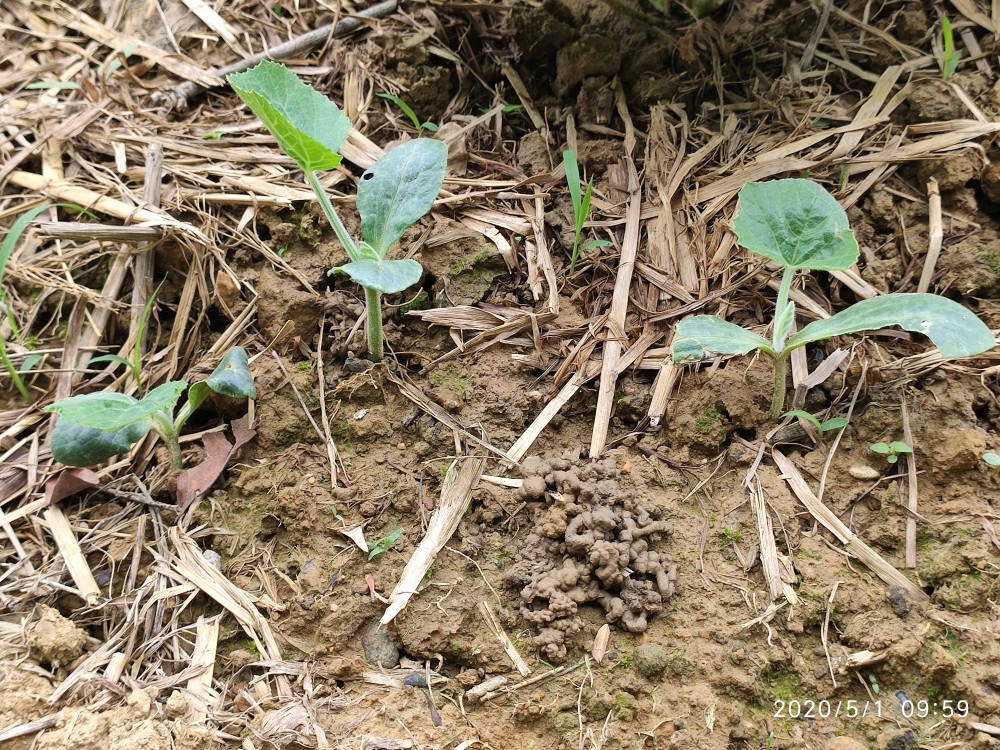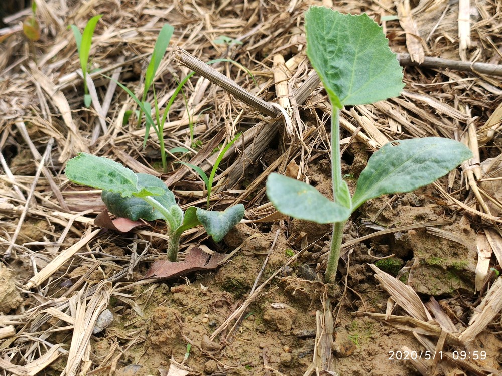 移植丝瓜的时候顺带把水沟里的一株不知道是什么瓜(很可能是南瓜)的野生秧苗一并移植到了丝瓜的另一头