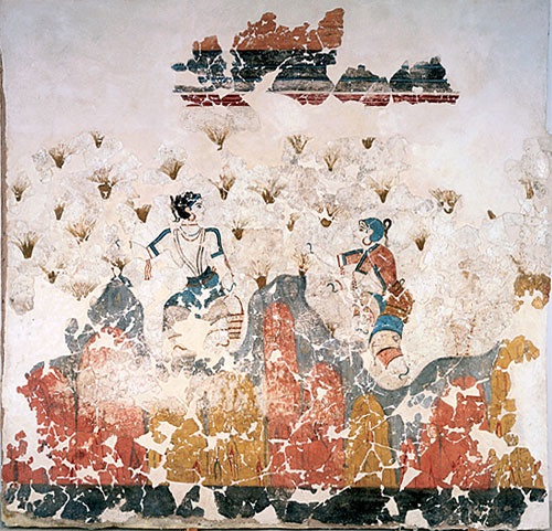 番紅花在希臘羅馬古典時期(西元前八世紀至西元後三世紀)扮演著重要的角色。然而,希臘文化的番紅花其實起源於青銅器時代。克諾索斯宮殿的米諾斯克里特的壁畫記載了番紅花的收成,描繪著年輕女子與猴子採集番紅花花朵的情景。其中一個壁畫遺跡位於希臘聖托里尼島(古希臘時稱做錫拉島 (Thera)),亞克羅提利的賽斯特三號("Xeste 3")建築。賽斯特三號壁畫始於西元前1600–1500年間另有各種其他的年代說,如西元前3000–1100年間,以及西元前十七世紀等在他們的畫中,希臘女神監督著花朵的采摘與柱頭的挑選,以製成治療的藥材。同一址出土的另一壁畫也做了一名婦女以番紅花治癒其出血的腳的描畫。這些錫拉島壁畫是最早紀錄了將番紅花用作草藥的精密植物學畫像。米諾斯在聖托里尼島亞克羅提利種植番紅花的居地,最後於西元前1645年至1500年間,被強大地震與併發的火山爆發摧毀。火山灰掩埋並保存了番紅花壁畫。