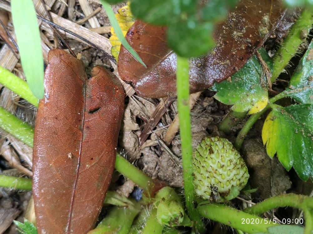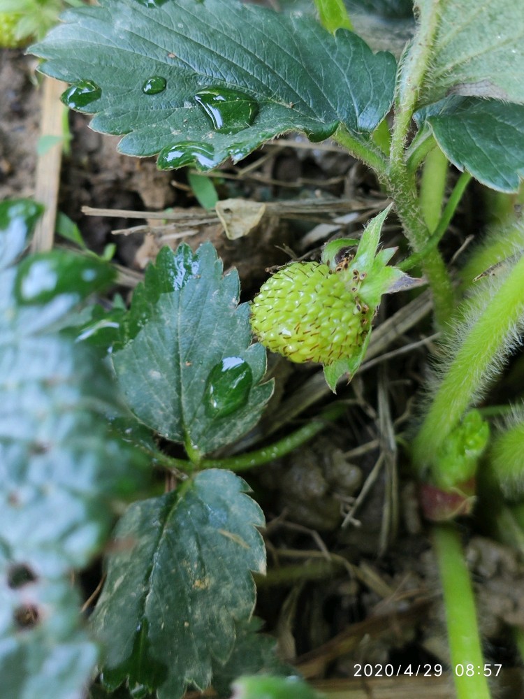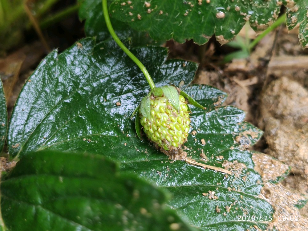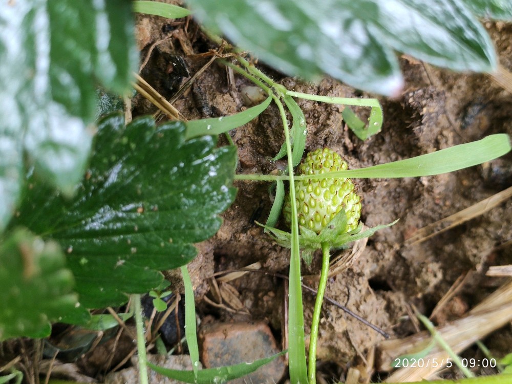 三枚草莓果长大了一点点,经过风雨的洗礼反而是一副脏兮兮的样子