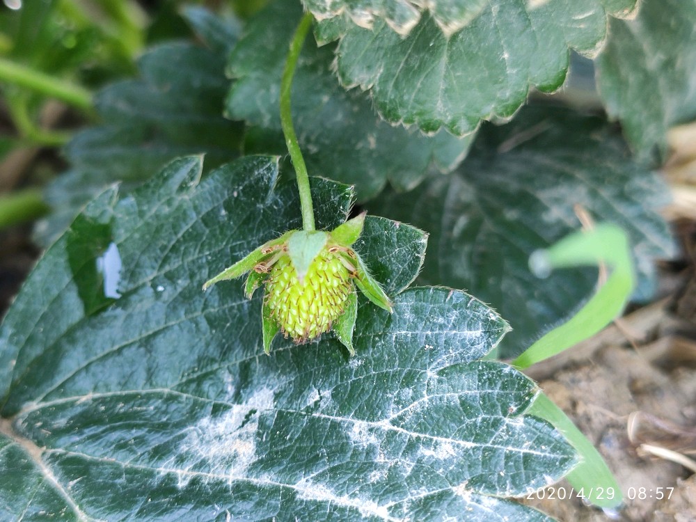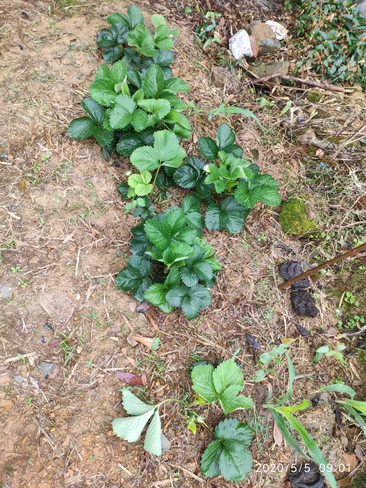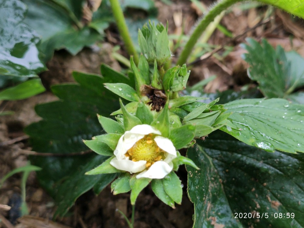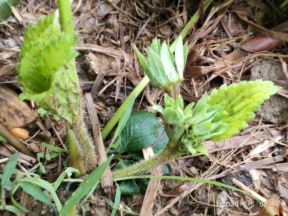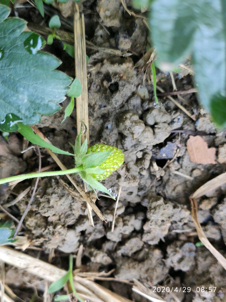 三枚草莓果长大了一点点,经过风雨的洗礼反而是一副脏兮兮的样子