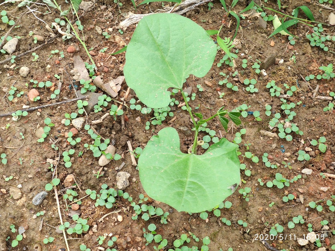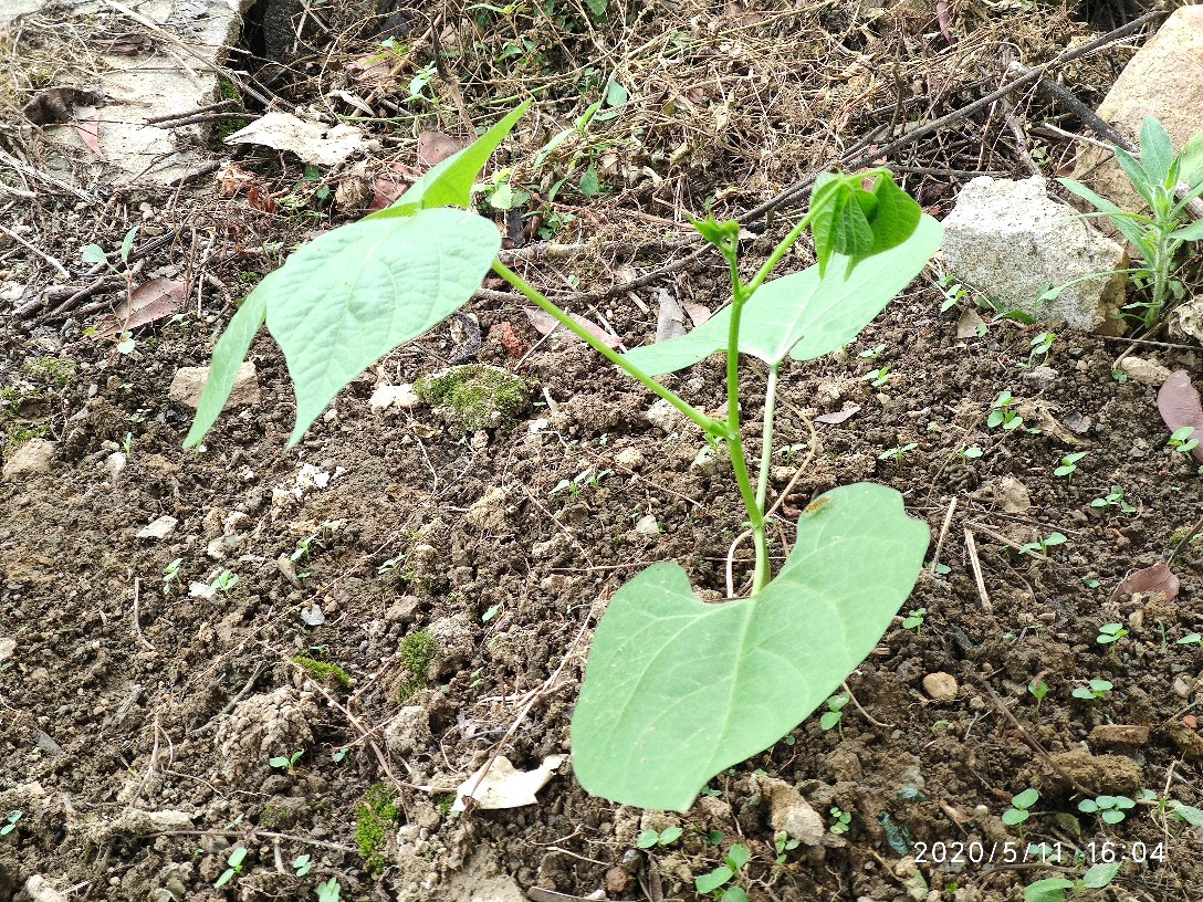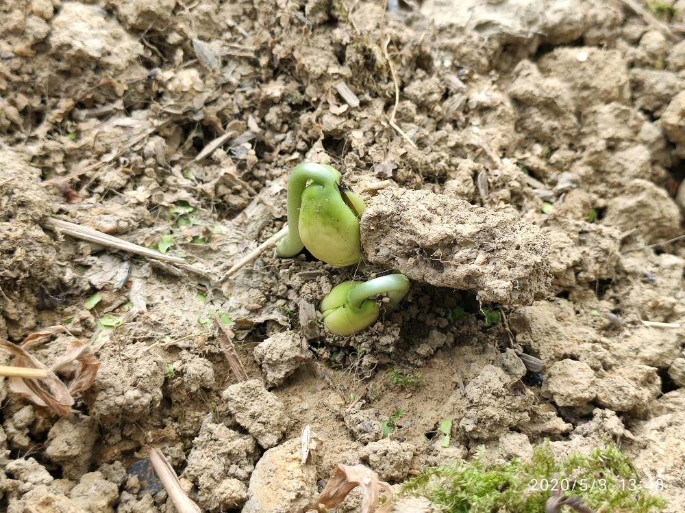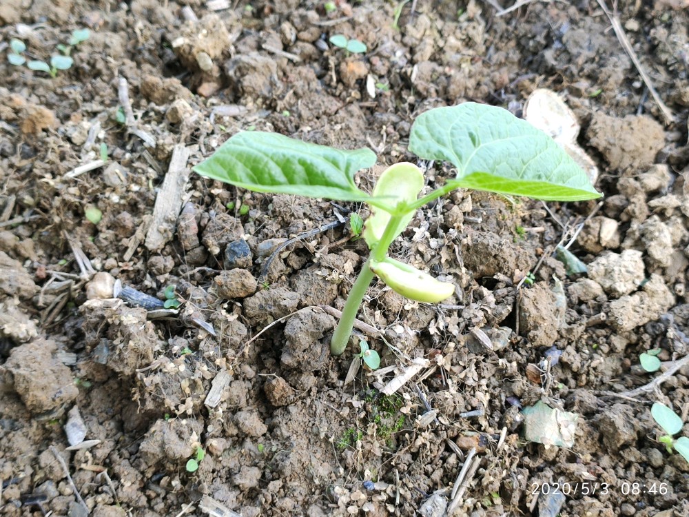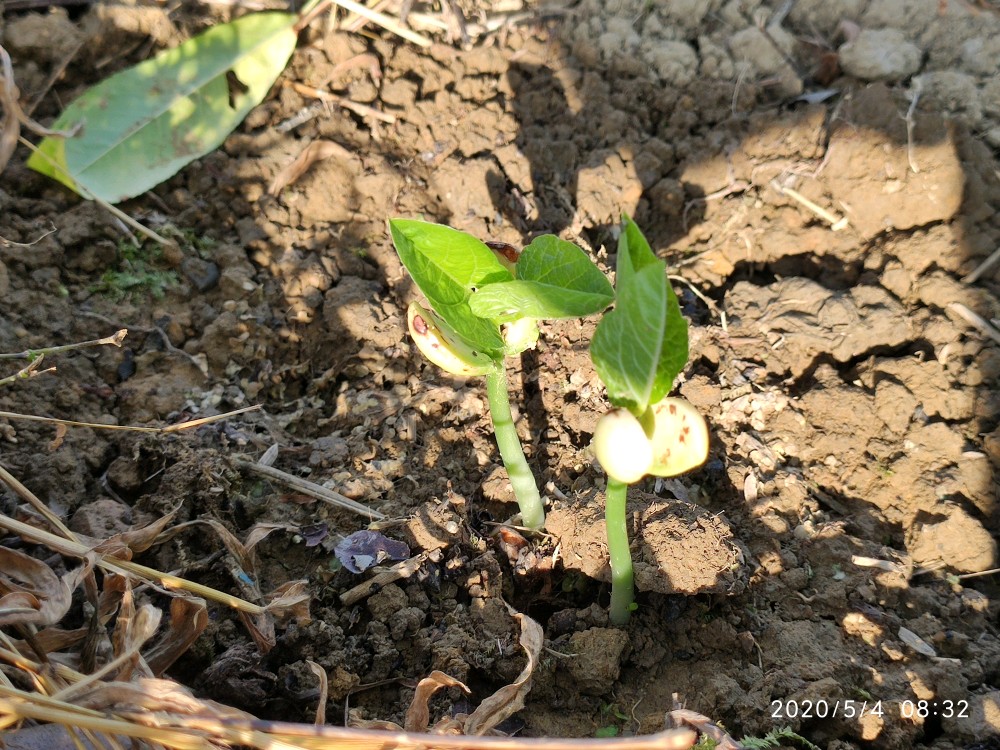 桃树下的眉豆,其实都播了三粒种子。不知道为什么只有这一处长了两棵出来