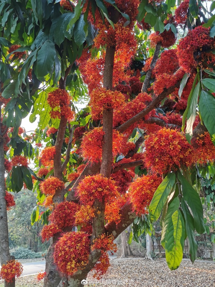 树龄:20年 此树位于广东省华南植物园内。枝繁叶茂,树冠高大,呈圆球形。嫩叶紫红色,像一件件袈裟高挂枝头,成熟后变深绿色。花大而艳丽。