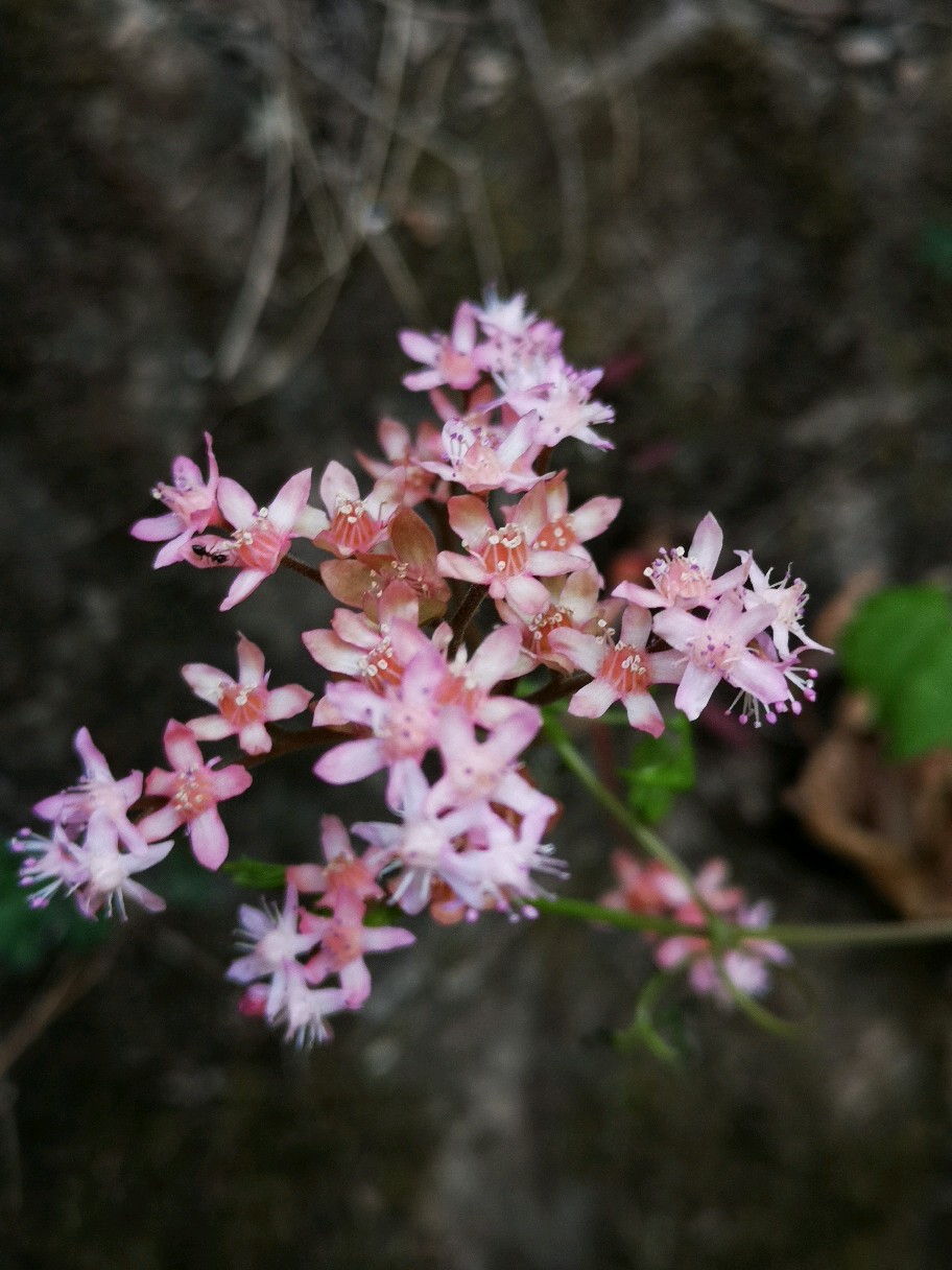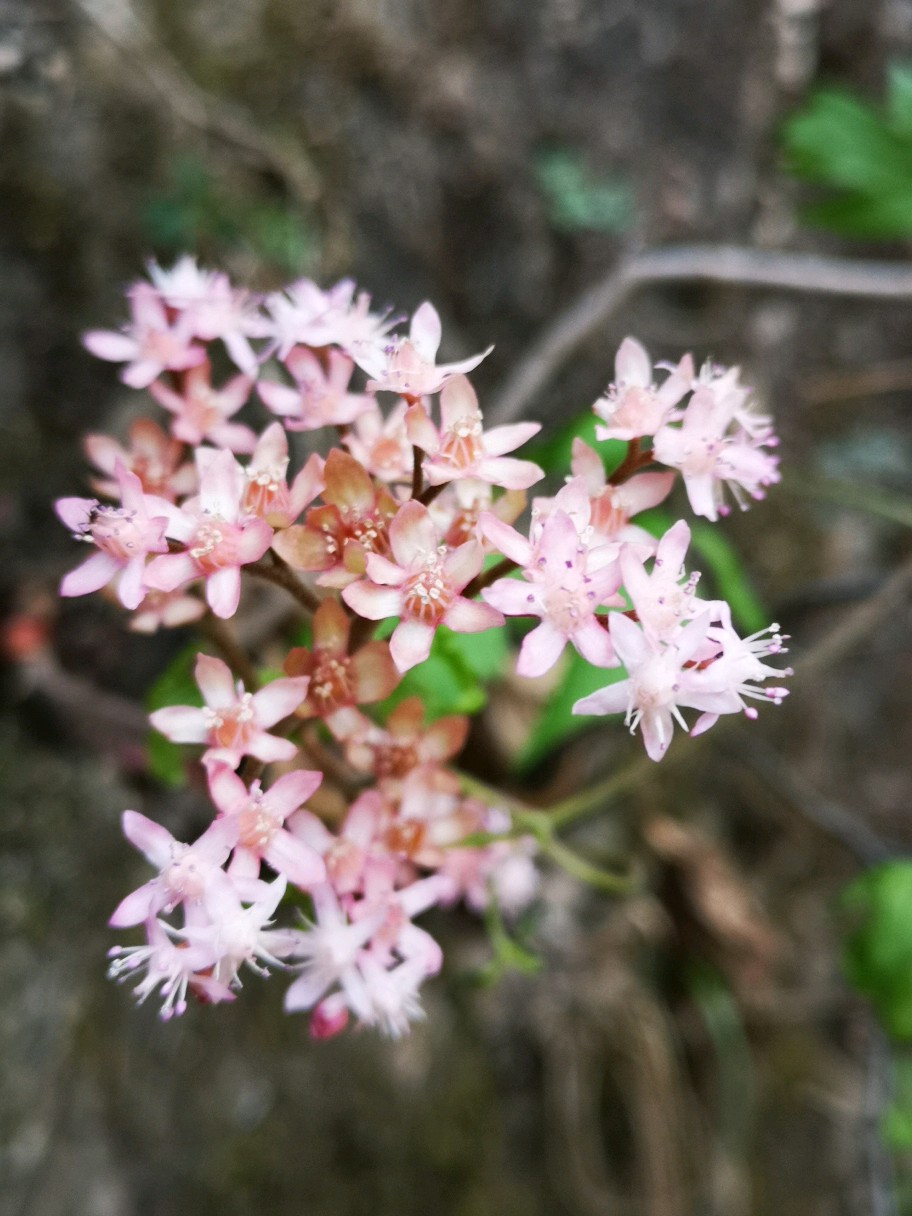 她们一个个从岩缝里伸出头来,开一头五瓣小粉花,点缀在大朵的白色槭叶铁线莲周边,很是招人喜欢。