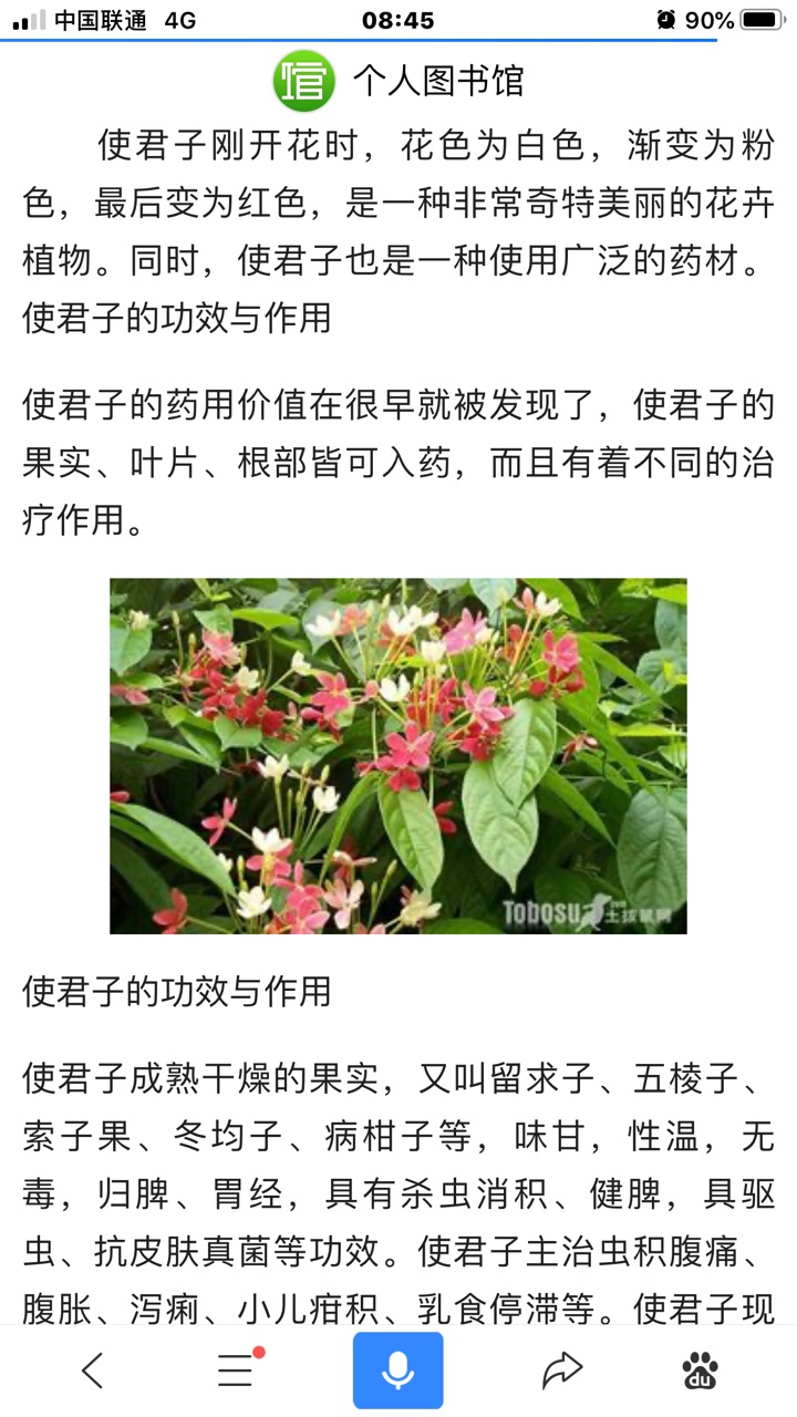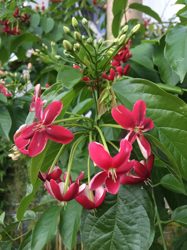 使君子现在作为一种美丽的花卉植物,很多地方都有种植。其花朵虽小,但花瓣厚实,而且一簇簇拥在一起,远观像一朵朵大花开满树头。更奇特的是花刚开时是雪白的,然后慢慢变粉,最后变成红色。所以更显得格外缤纷。花谢后,逐渐长出果实,犹如一簇簇小小的杨桃缀满枝头。这果实对治疗小儿蛔虫有奇效,所以又被称为留求子。