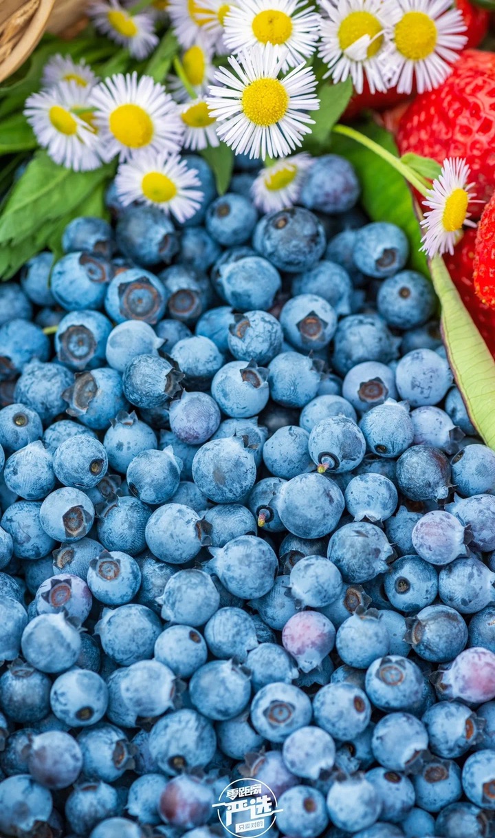 蓝莓果实大小、颜色因种类而异。多数品种成熟时果实呈深蓝色或紫罗兰色,如兔眼蓝莓、高丛蓝莓和矮丛蓝莓等,少数品种为红色。果实有球形、椭圆形、扁圆形或梨形,平均单果重0.5 ~ 2.5 g,直径0.8 ~ 1.5 cm不等,兔眼蓝莓的单果重最大可达到25 g。蓝莓果实一般在花后70 ~ 90天成熟。果肉细软,多浆汁。种子细小,食用时可随果肉食下而不影响口感
