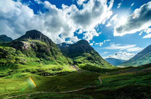 苏格兰高地人烟稀少,有多座山脉,包括英国境内最高峰本内维斯山,在山脉间还会有红色河水的小溪缓缓流淌。知名电影《勇敢的心》就是在这个悲凉的荒野上拍摄,同时获得奥斯卡金像奖最佳影片、最佳导演等五项大奖,将苏格兰高地的壮观景象搬到了银幕上。