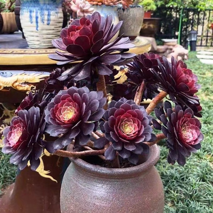 黑法师是景天科莲花掌属的栽培品种,自然界不存在分布。紫黑色的叶片呈莲座状层叠排列,给人以庄重神秘之感,观赏价值高。宜用排水透气良好的介质种植。