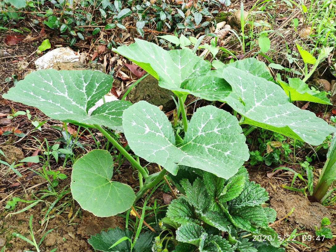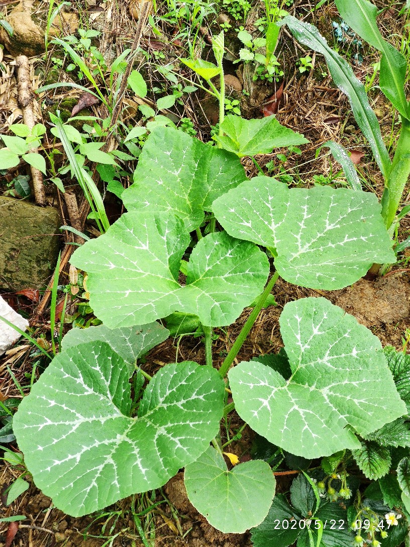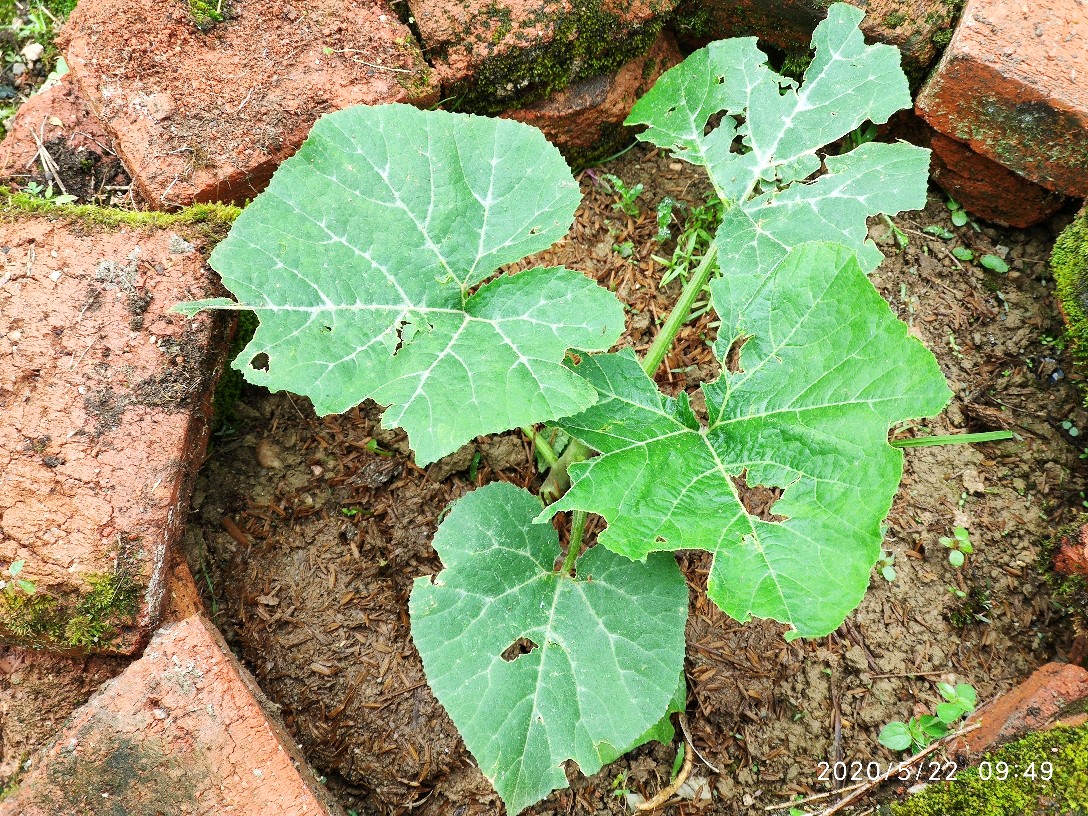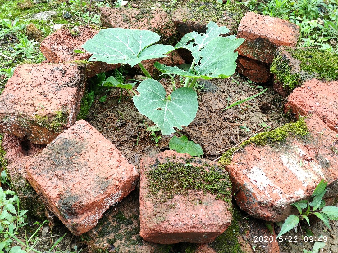 最后这一棵也是水井旁捡的南瓜苗,种的时候还很小一株,现在也长的是不错了。前天给他们施了点肥农家肥后,小鸡开始在它身边左刨刨又啄啄的,你看叶子全啄烂了。无奈,只好捡了点砖头把它围起来