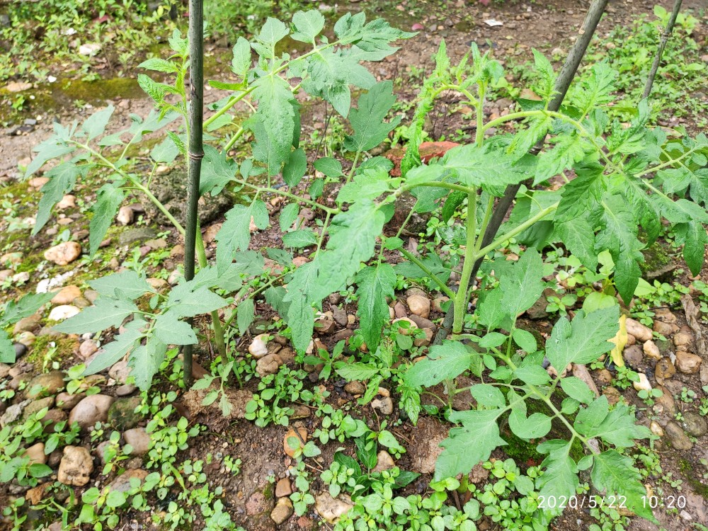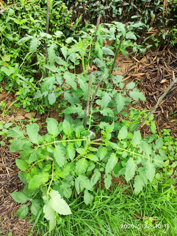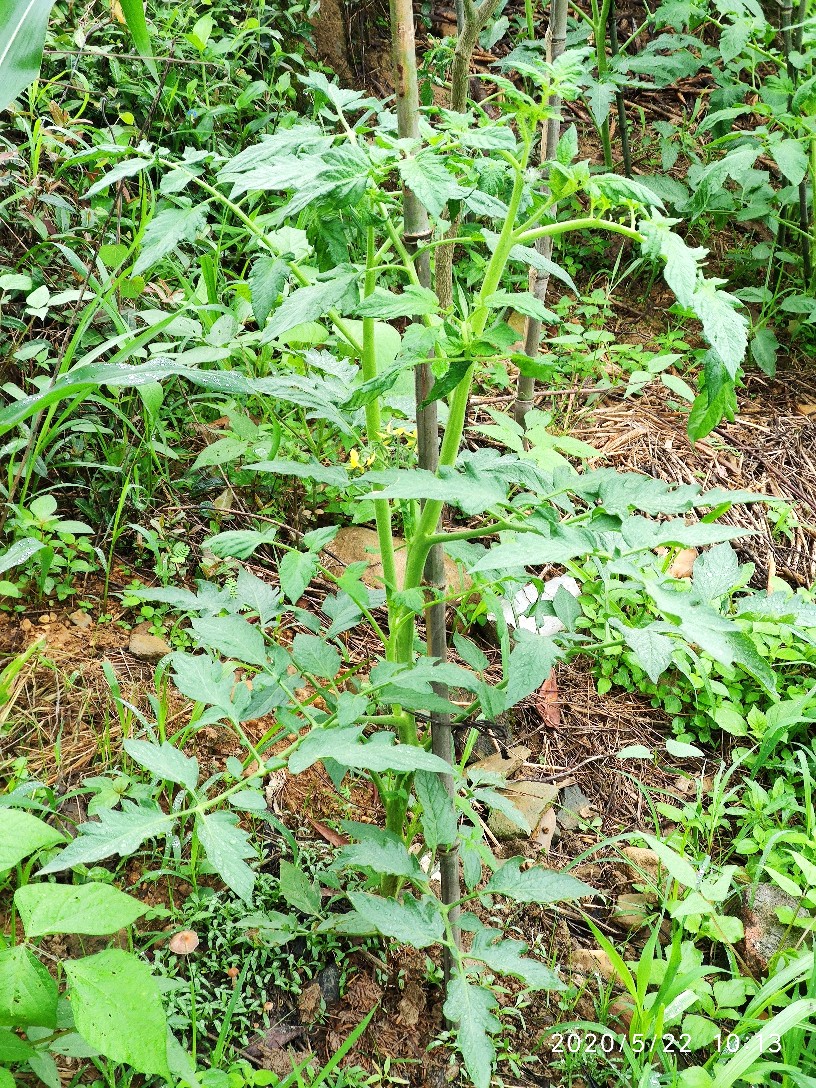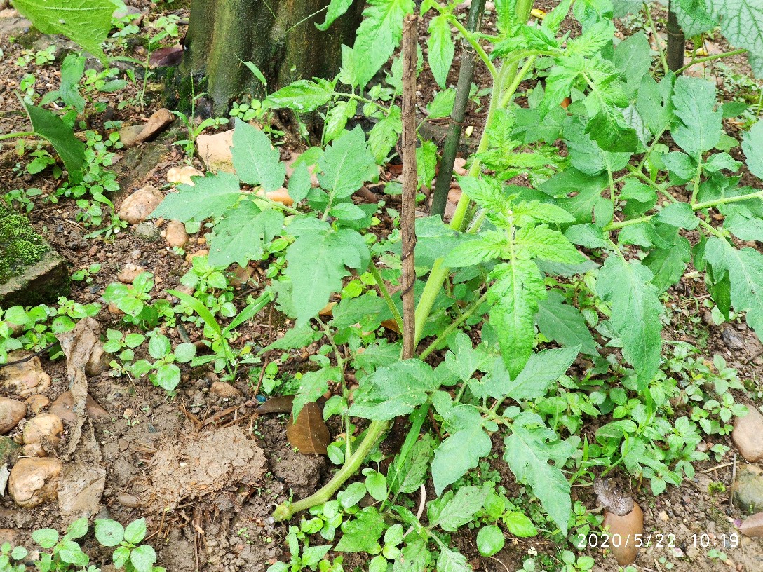 这是一株不知道是捕蛙人还是捕蛇人踩过的番茄,当时都已经踩断了,匍匐在地的一个状态。现在又活过来了,感觉跟没经过那场噩梦一般