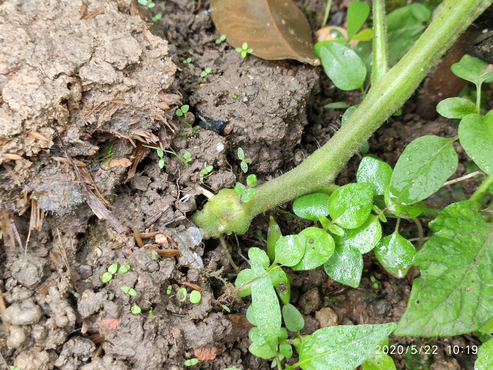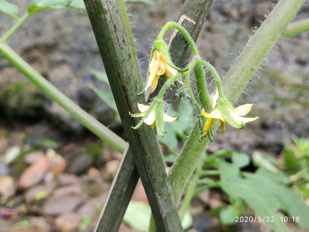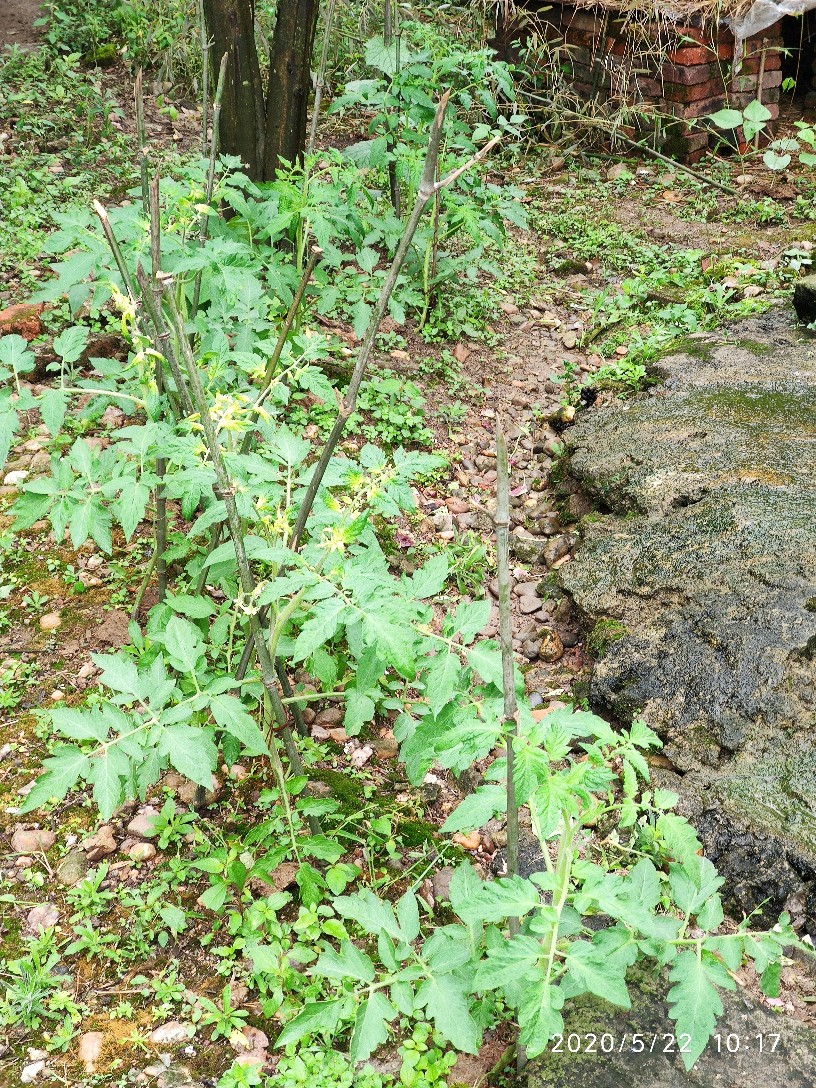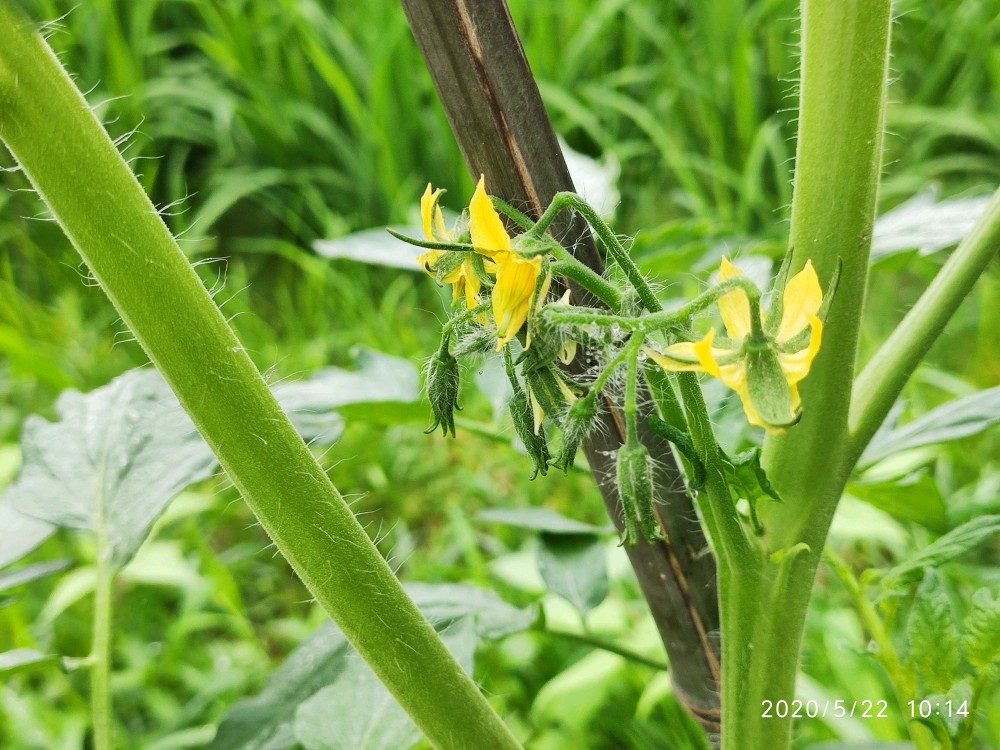 这是一株不知道是捕蛙人还是捕蛇人踩过的番茄,当时都已经踩断了,匍匐在地的一个状态。现在又活过来了,感觉跟没经过那场噩梦一般