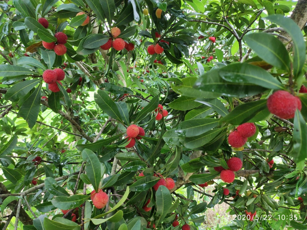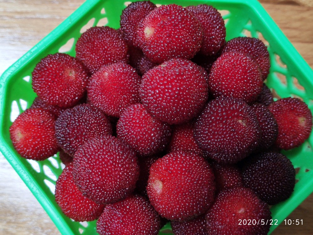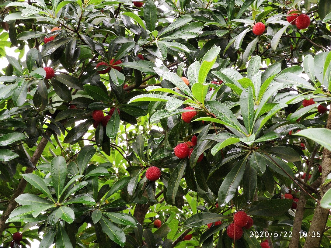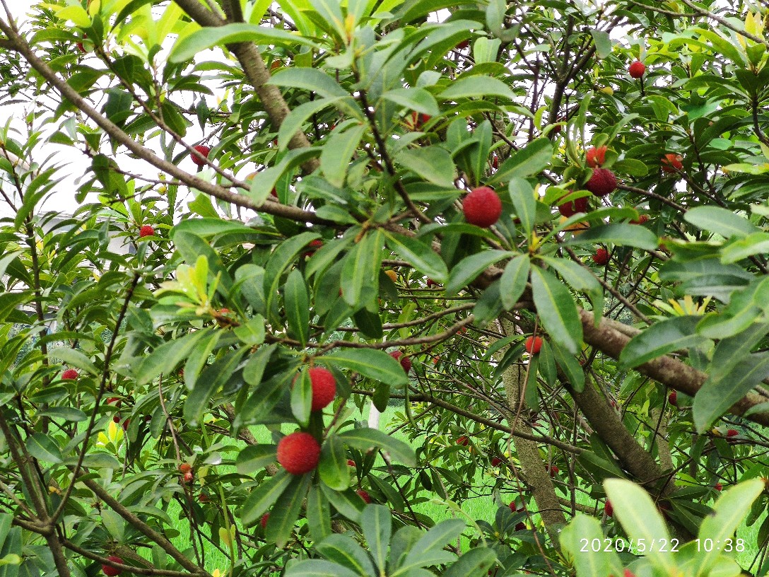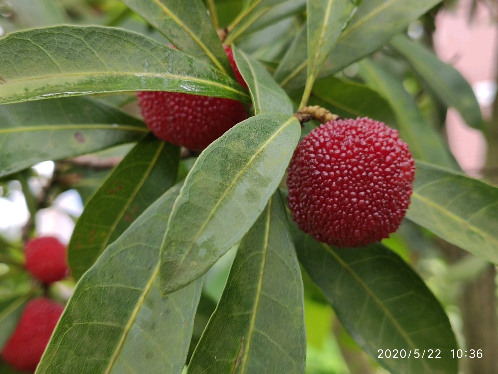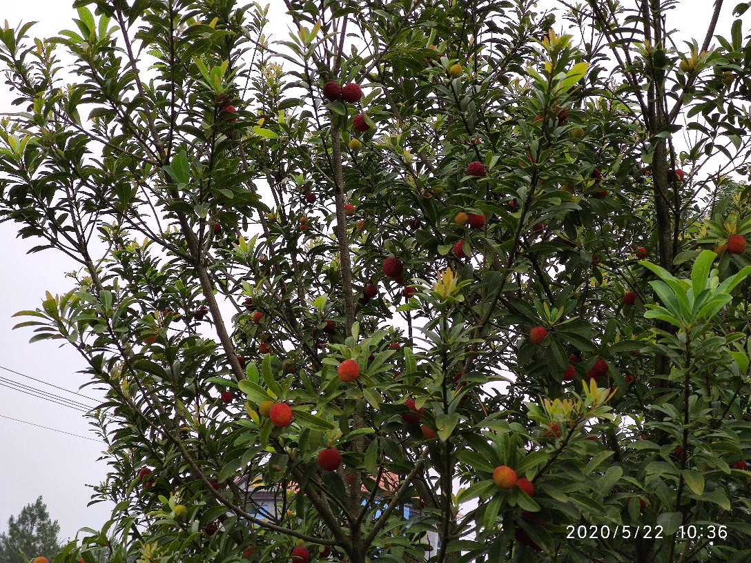 本没打算拍杨梅,可突然想到今天都周五了。再不拍,等下午那几个神兽回来洗劫一空后可是想拍都没得拍了。两棵杨梅还是分别给个镜头吧,这应该是它们的巅峰时刻了,值得拥有一张单人照