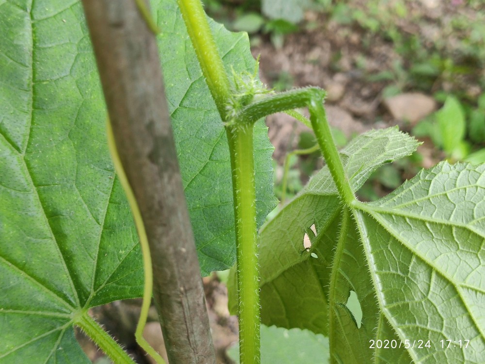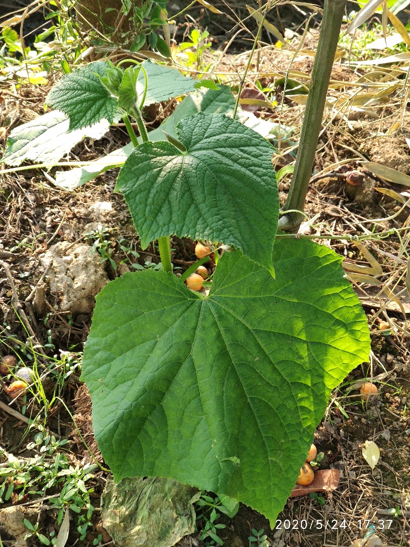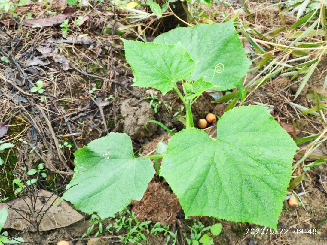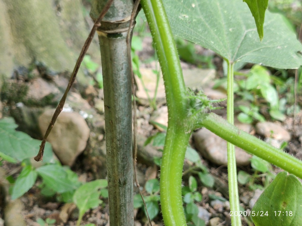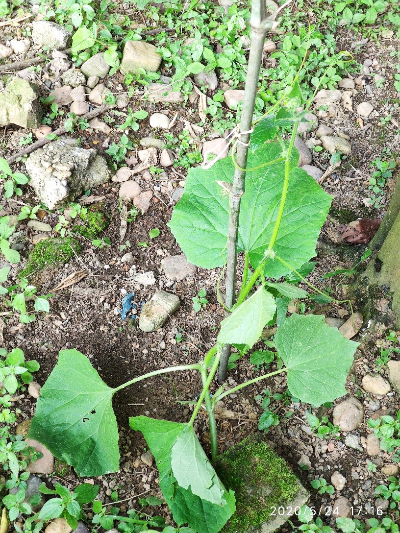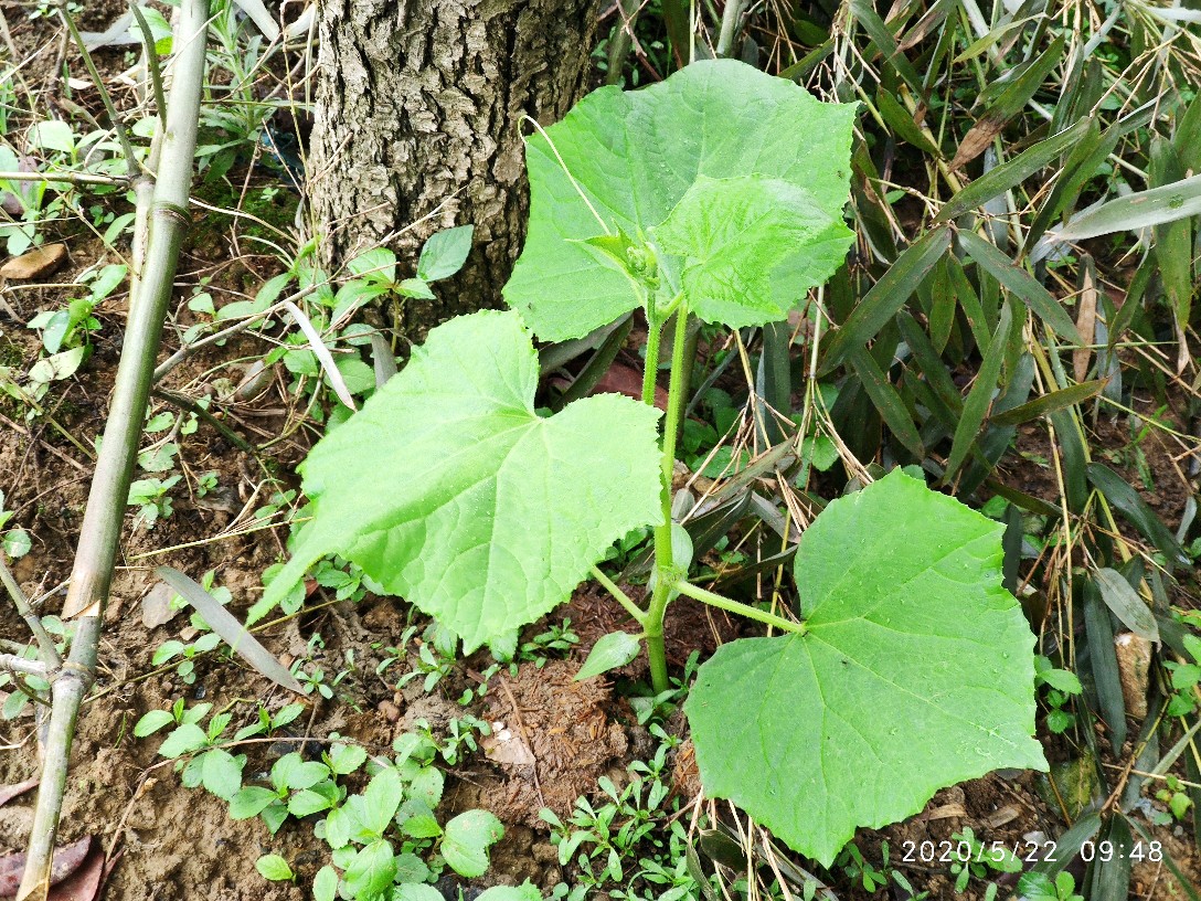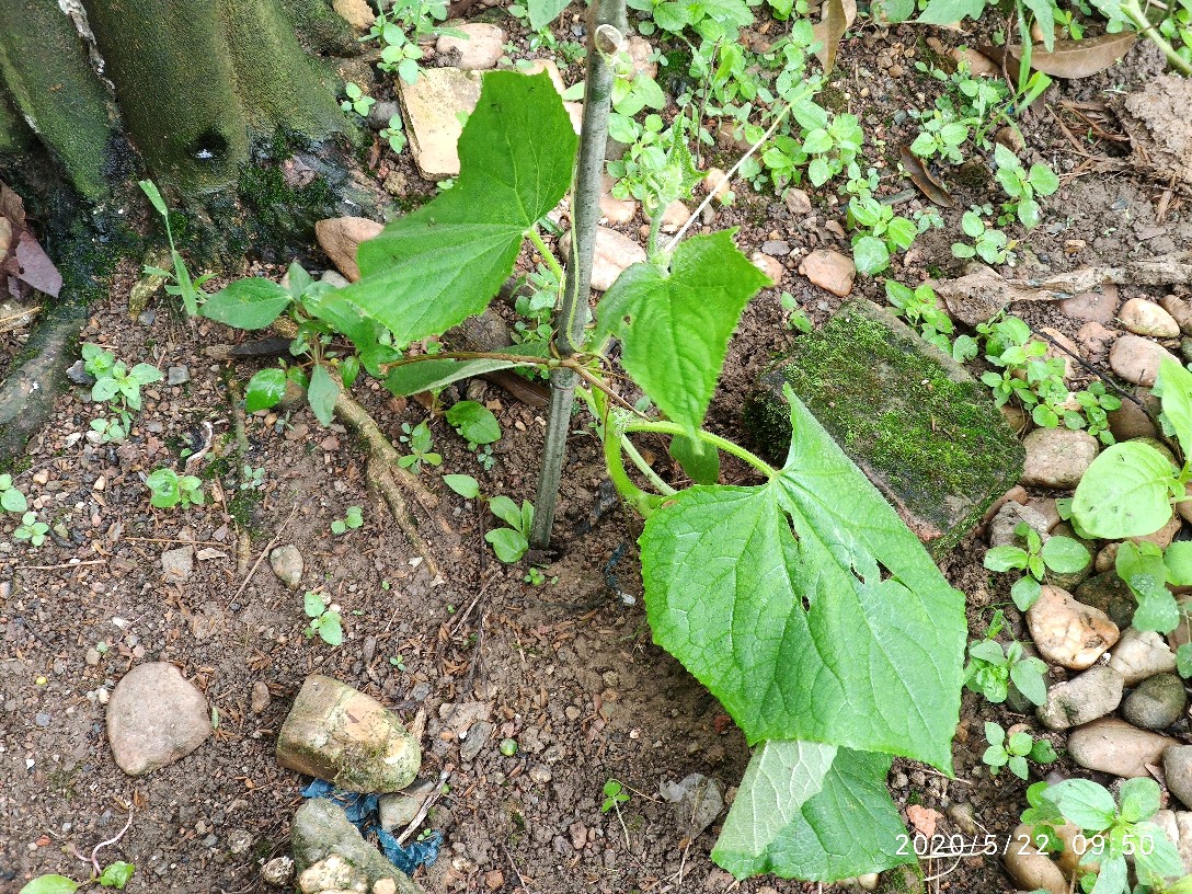 这是21号傍晚弄断的,靠近泥土部分大概一指宽的距离也不知是小鸡啄断的还是怎么弄的反正整个茎被折断了,我以为它活不了了,心痛之余后也就没再管它。第二天早上起来的时候老爸便对我说,这棵黄瓜我处理了一下还能活。然后我便看到黄瓜苗的断面已经用泥土掩埋并放置了一块砖头在上面。还插了一根小竹子让它攀爬,一开始对于它是否能活我其实是没信心的。