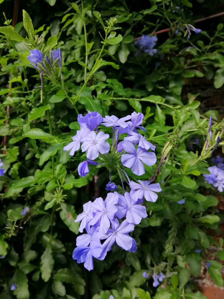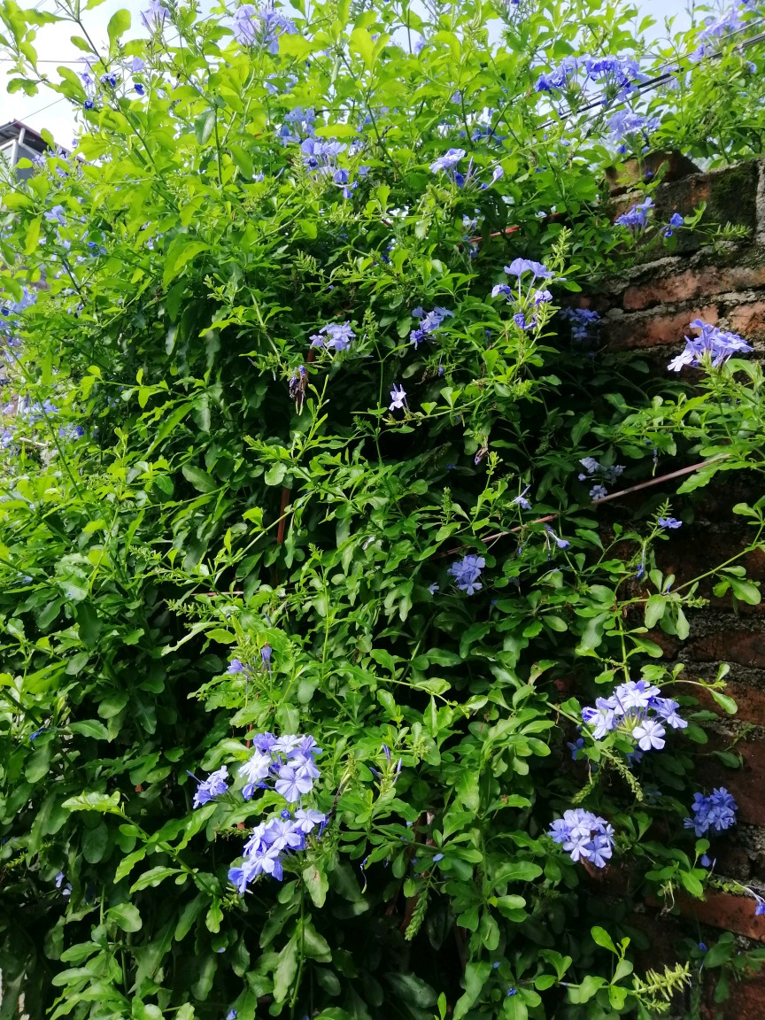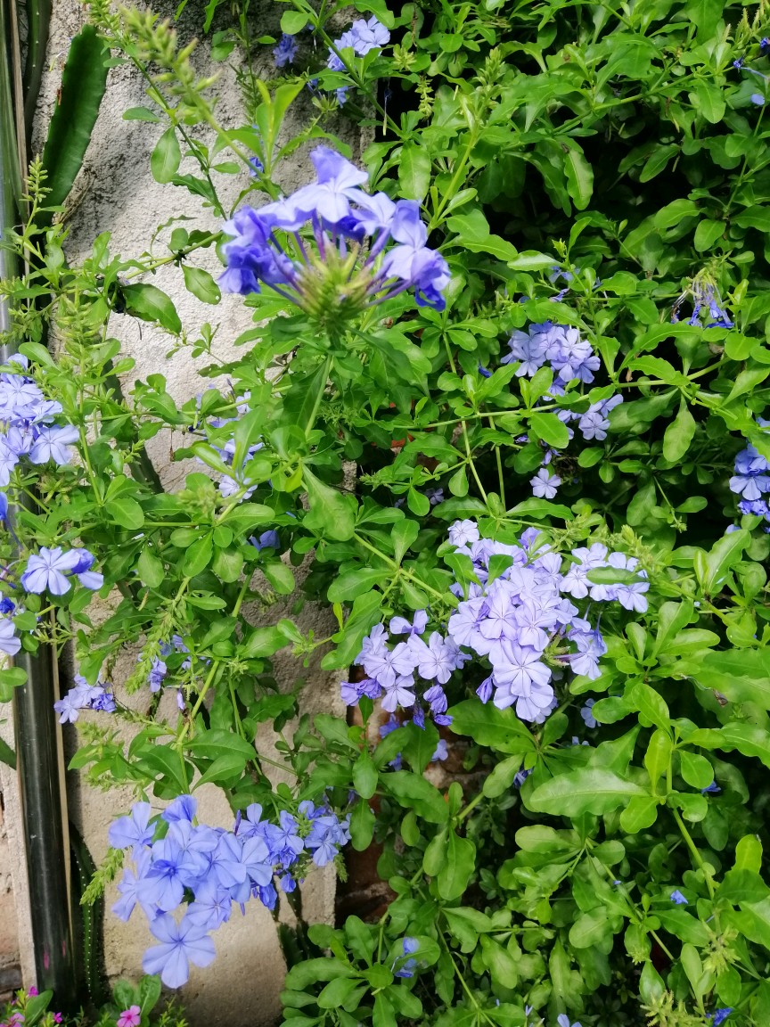 今天去一花友家院子赏花(太羡慕她家的院子了),她栽养的蓝雪花已爬到墙上,在夏日的阳光下,特别的清新淡雅……