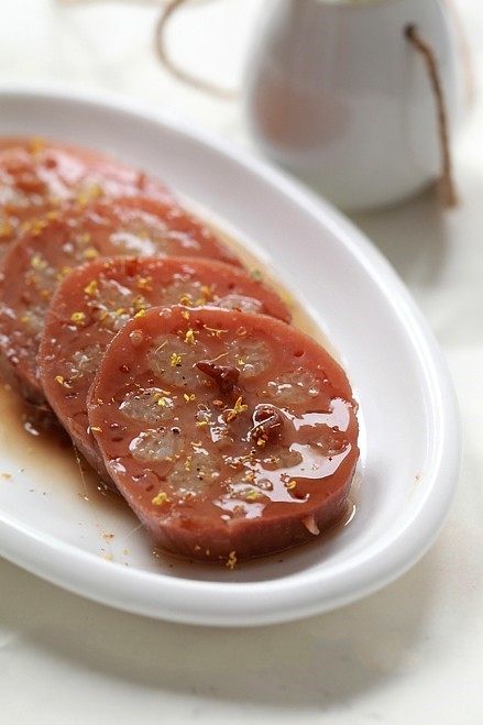 5.吃前切成片,淋点煮藕的汤汁上去,撒点干桂花装饰。清新又美味,