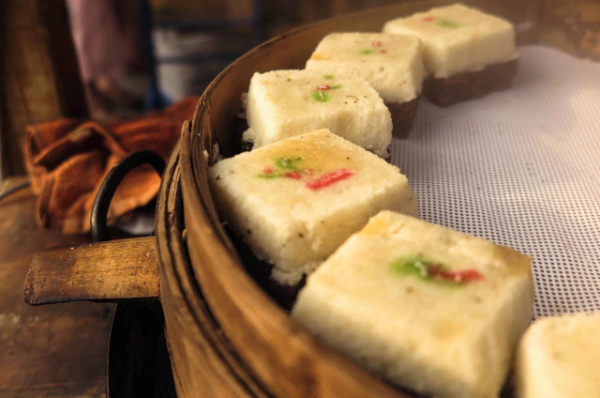 8.隔水蒸熟蒸透,晾凉后,用凉水蘸刀切小块,加鲜桂花装点即可。