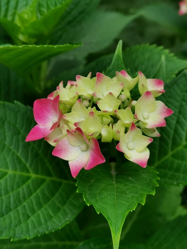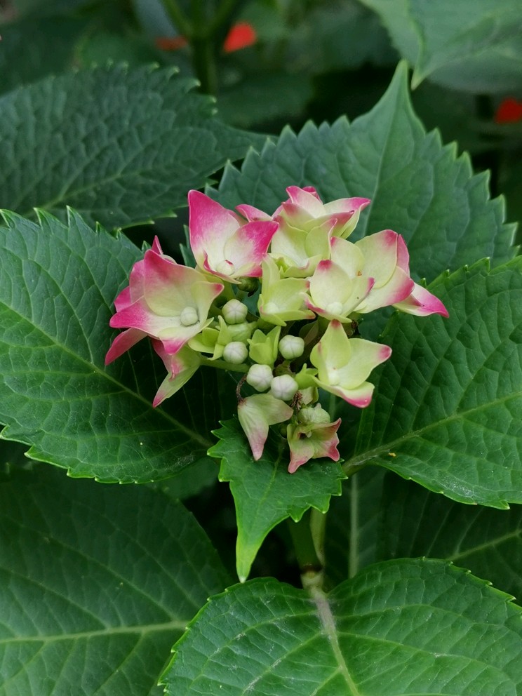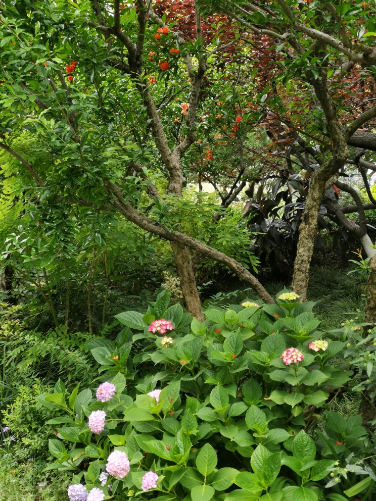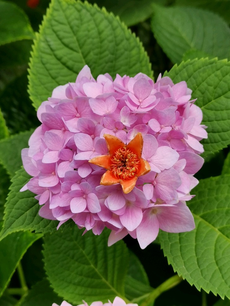 石榴树下几株绣球开的正好,被吸引过来拍照的我,注意到落下的石榴花托不偏不倚掉在了一朵绣球上。似乎成了绣球的花心。