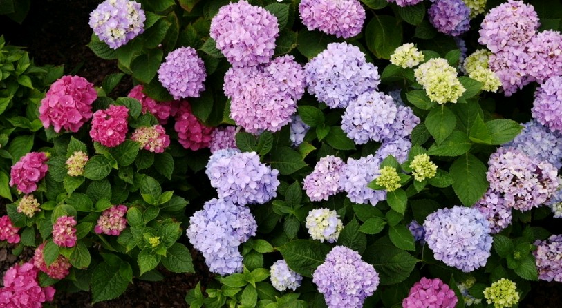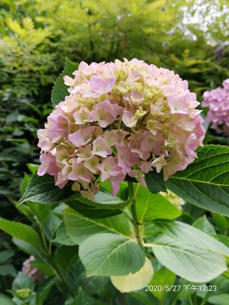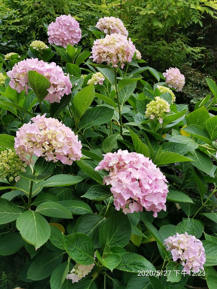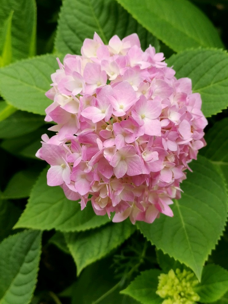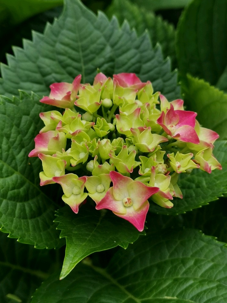 石榴树下几株绣球开的正好,被吸引过来拍照的我,注意到落下的石榴花托不偏不倚掉在了一朵绣球上。似乎成了绣球的花心。