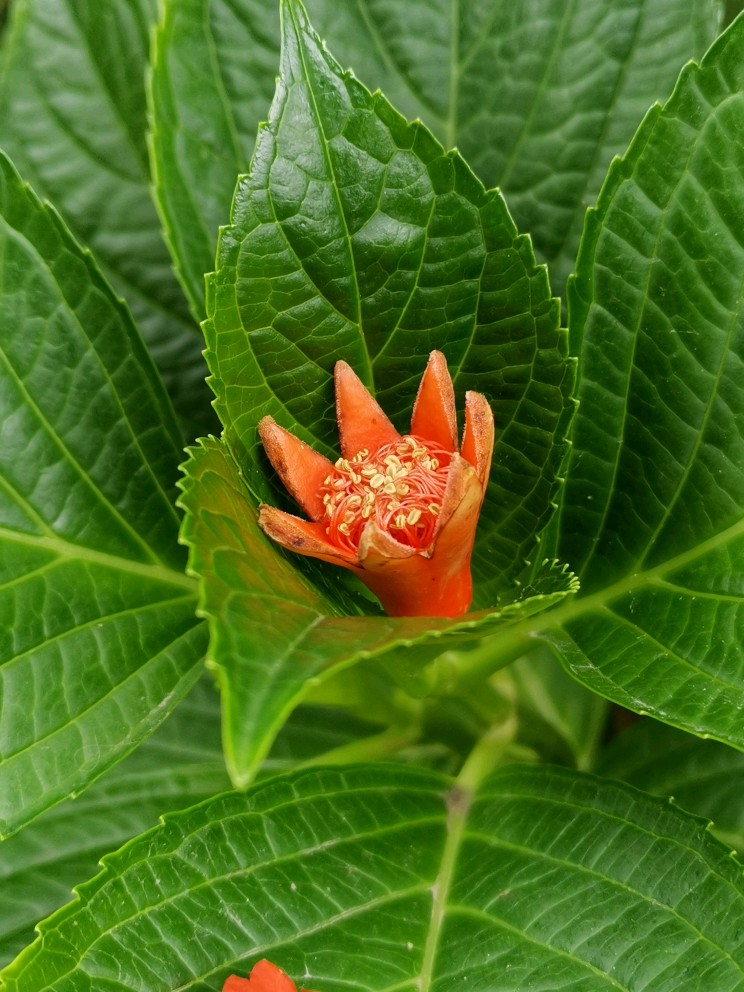 这一朵石榴花,与绣球之绿叶也是绝配了。