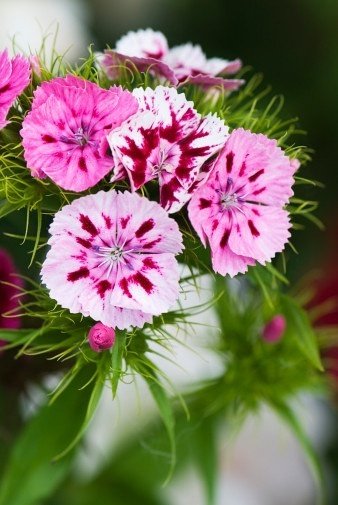 石竹自然花期5~9月,从暮春季节可开至仲秋,在南方可以花开四季。花色有白、粉、红、粉红、大红、紫、淡紫、黄、蓝等,五彩缤纷。
