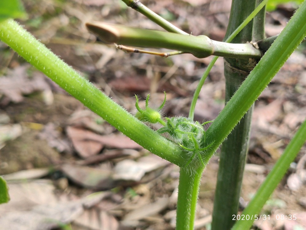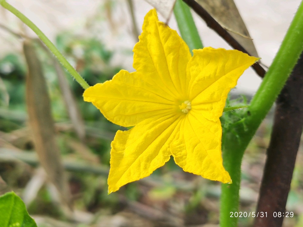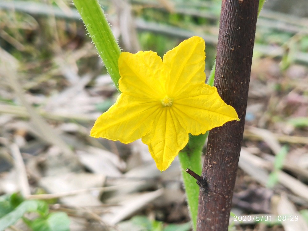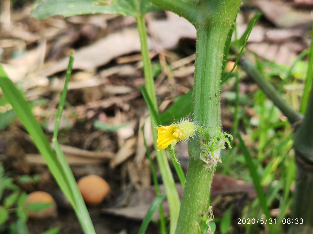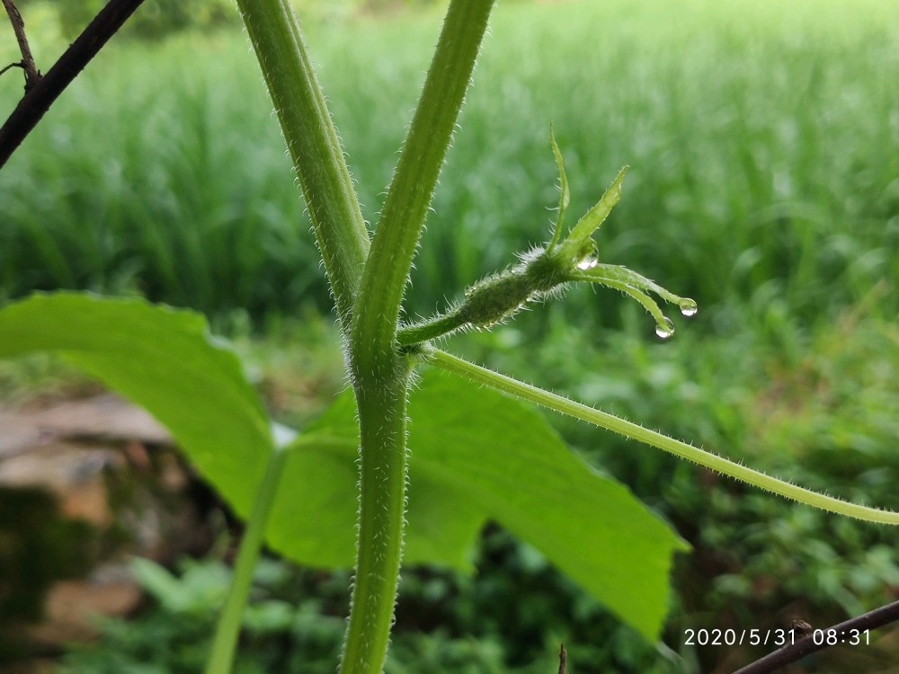 一开始是种了四棵小黄瓜的,其中一棵相对远点过去的途中也尽是杂草,从来也不曾去看过了。所以也就相当于种了三棵。