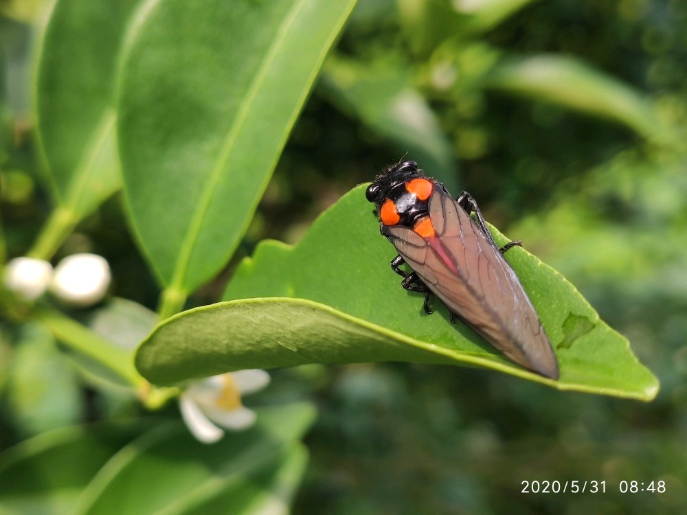 偶然间在叶片上看到一只小时候的玩物,不知其学名为啥,以前老是喊它“知了”,早晨刚出壳时翅膀是白色的,人家也没有胡须不知道为什么却一直喊它“白须老人”