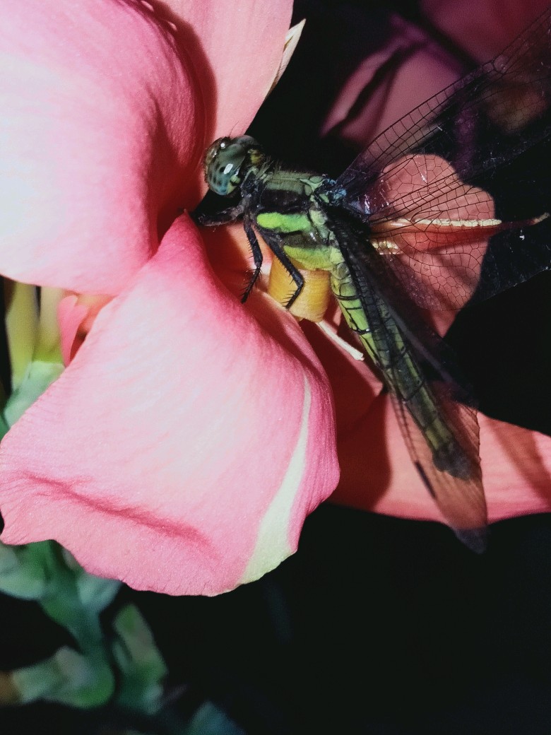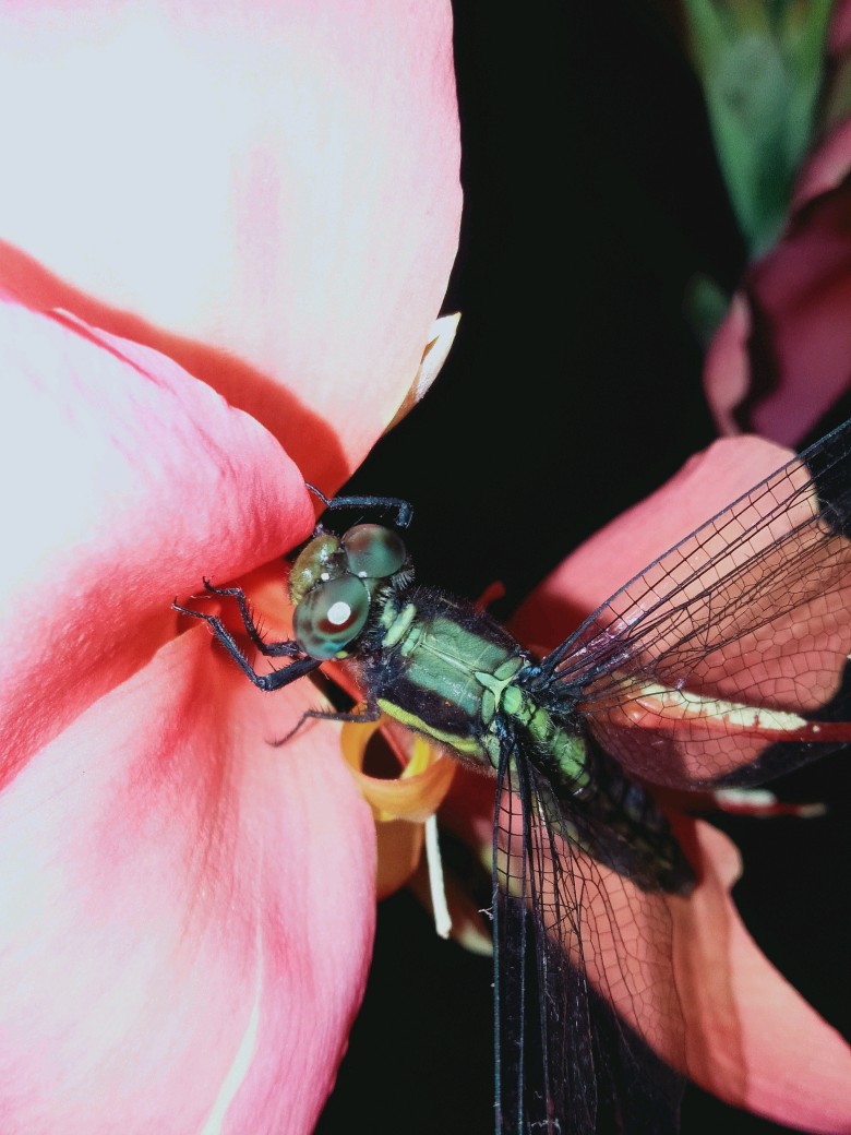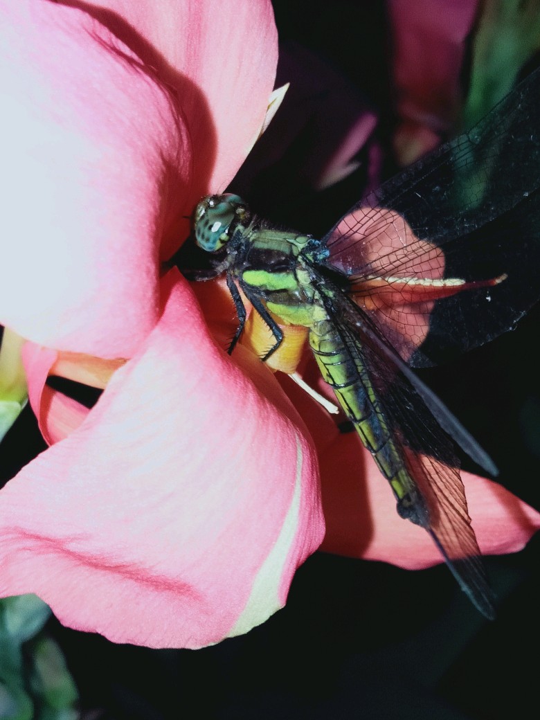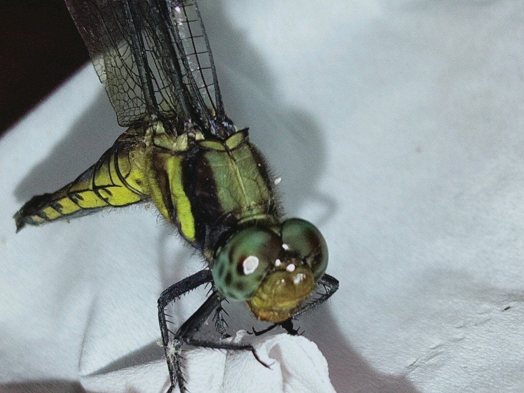 没想到第一只是绿色蜻蜓!眼睛看得我心里一阵反感,果真是距离产生美,近距离观赏我反还嫌弃上了。比起这些大家伙我还是喜欢豆娘(非常小的类似蜻蜓的昆虫)多一些。蜻蜓咬人可疼哩!我只敢抓着它的一双翅膀看看