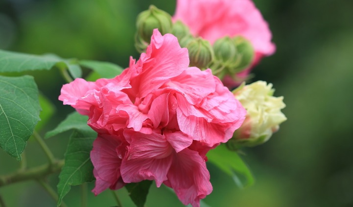 花梗和花萼均密被星状毛与直毛相混的细绵毛。叶宽卵形至圆卵形或心形,先端渐尖,具钝圆锯齿,上面疏被星状细毛和点,下面密被星状细绒毛;花初开时白色或淡红色,后变深红色,直径约8厘米,花瓣近圆形,疏被毛。蒴果扁球形,被淡黄色刚毛和绵毛,种子肾形,背面被长柔毛。花期8-10月。芙蓉花花大色丽,为我国久经栽培的园林观赏植物