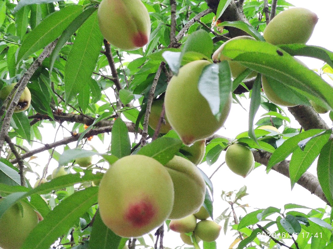 拍桃子的时候,刚好碰到老爸老爸和一个人聊着天回来。只听得那人说桃子好像今年还结不少呢!我爸说确实。那人说现在还不能吃吧?我爸说能吃蛮甜的。这个样子就能吃了吗?不能吃吧?!老爸又说,能吃昨天刚摘了几个很甜……然后领着那人过杨梅树,来到了桃树下……