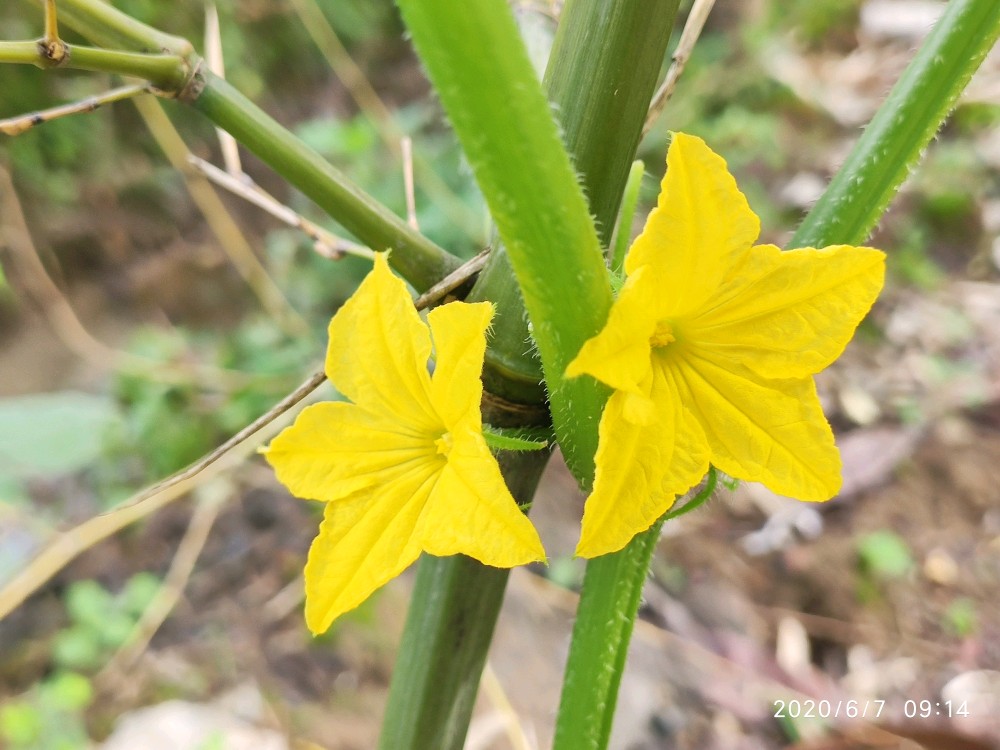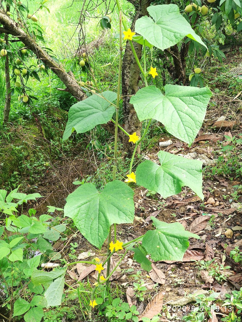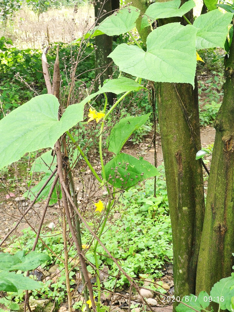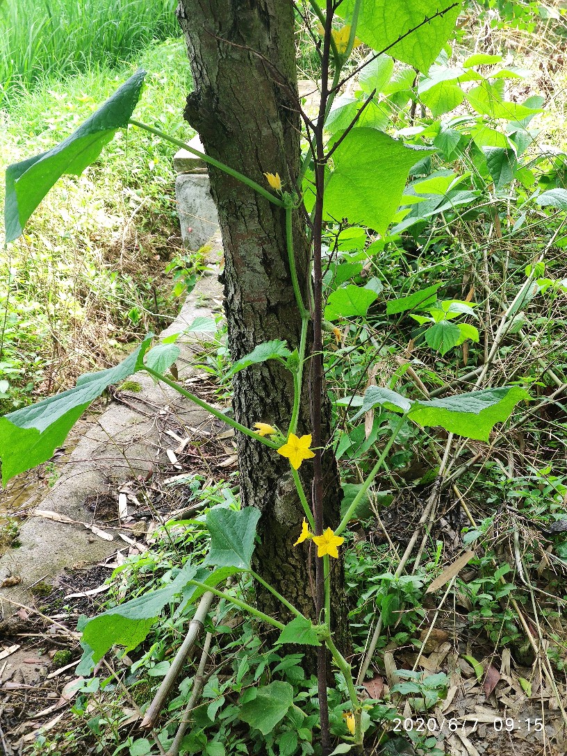 枇杷树下的这棵节节开花,也爬上了高高的枇杷树。虽说开了这么多花,可没有一朵是带有小黄瓜的雌花