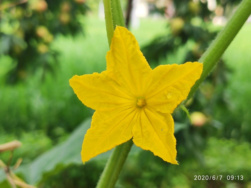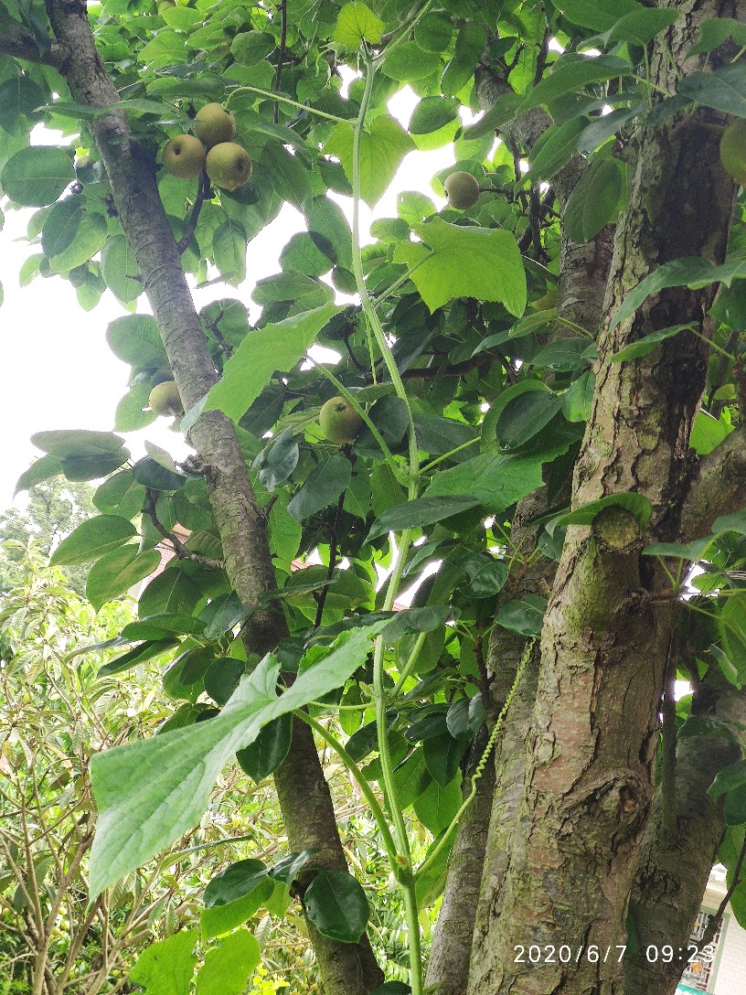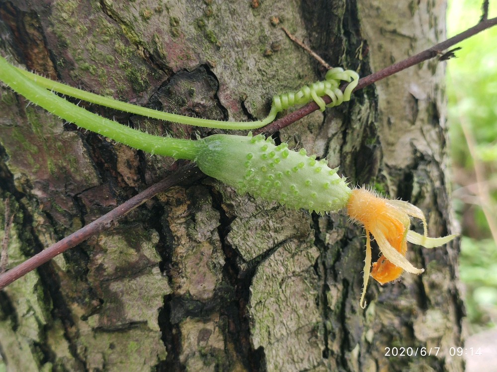 梨树下的黄瓜结出了第一根小黄瓜,还有一根还在花苞上。藤蔓已经爬上了高高的梨树