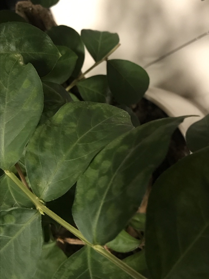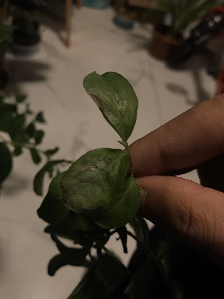 叶子看起来干干的,叶子正面看起来有白色一圈一圈的,背面局部叶子好像是长毛一样,有白色粉末状物质