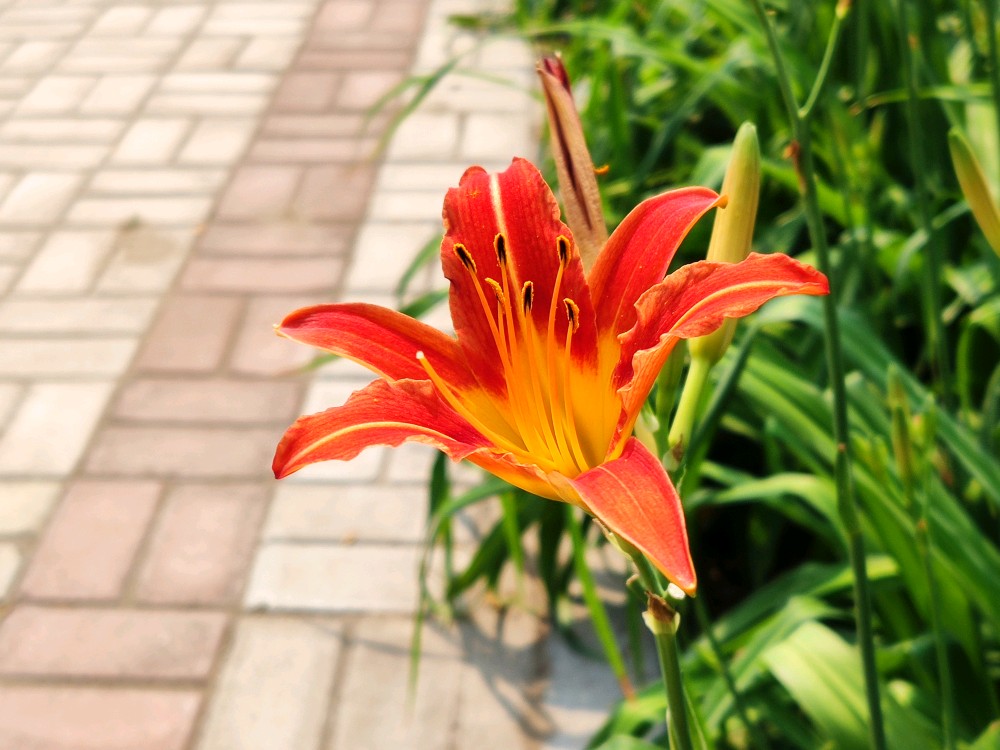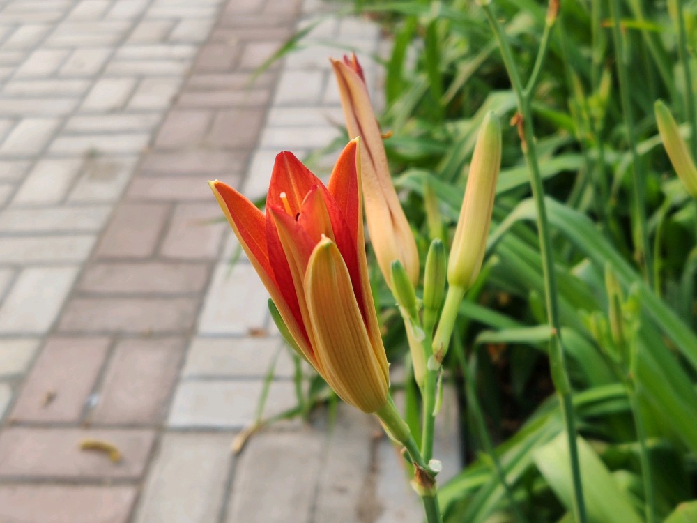 夏日的清晨,萱草花正在开放,花苞顶部的小尖头解锁,外面的三片花瓣慢慢张开,花瓣略窄,质感偏硬;接着里面的三个花瓣张开,花瓣稍宽,薄而柔软,边缘有褶皱。六片花瓣肥瘦相间,略微向外反卷,花瓣中间是一根花柱和六枚雄蕊,细长的浅黄色花柱偏向一边,花丝顶部的黑色花粉囊从两边裂开,露出艳黄色的花药。整个花冠从里到外由黄色渐变为红色,花色鲜亮,花形清雅,给人温和可亲的感觉。