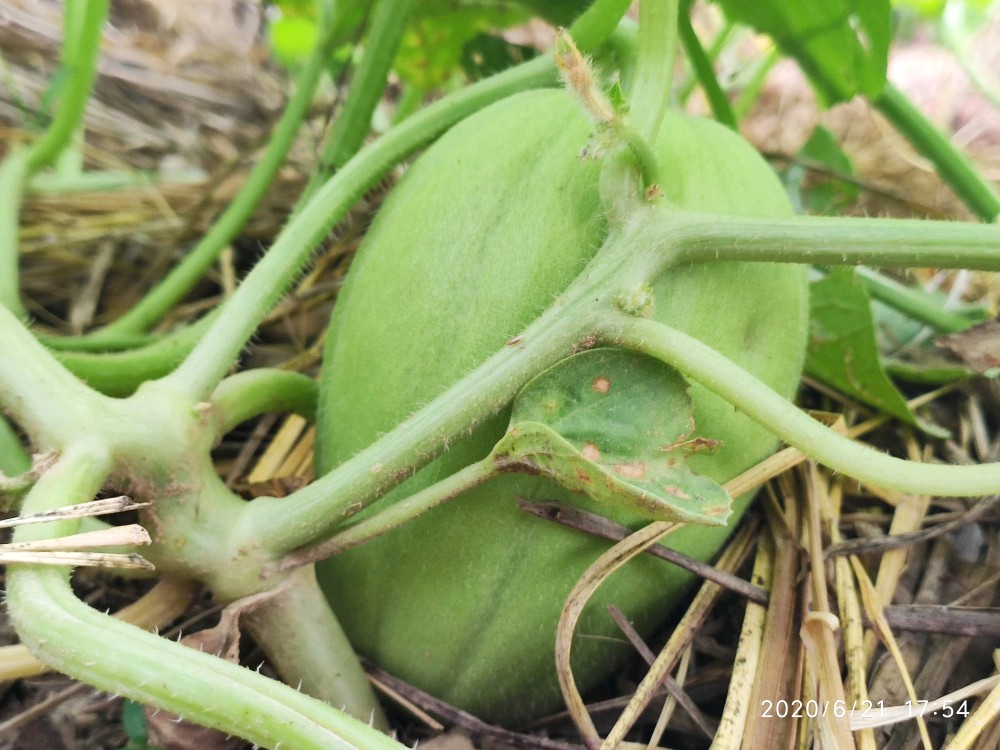 蜜瓜长的还真快,前几天看还是拇指般大小,现在都有拳头那么大了。不知道是这枚瓜没长好,还是就是这形状总感觉有点上圆下尖,另外一枚也是如此