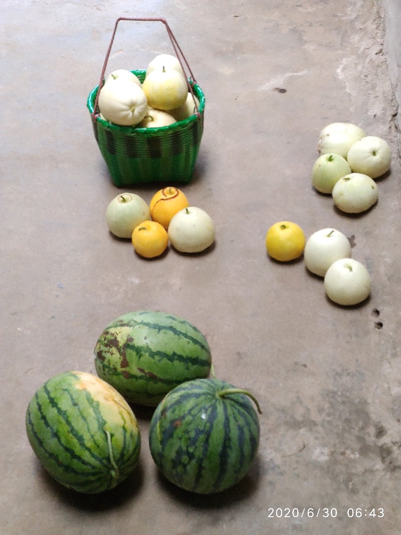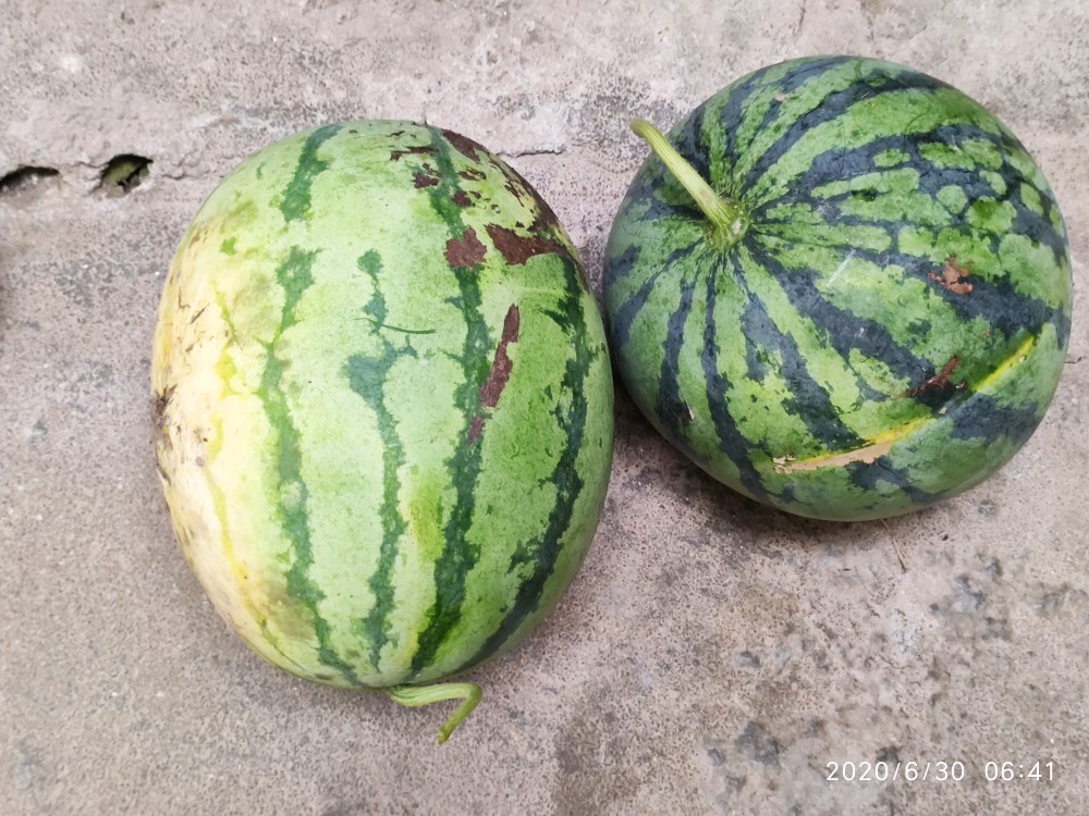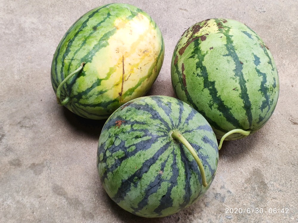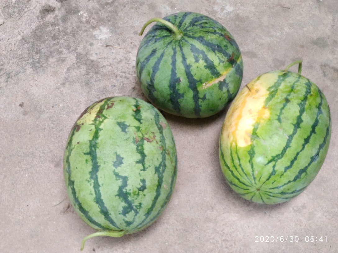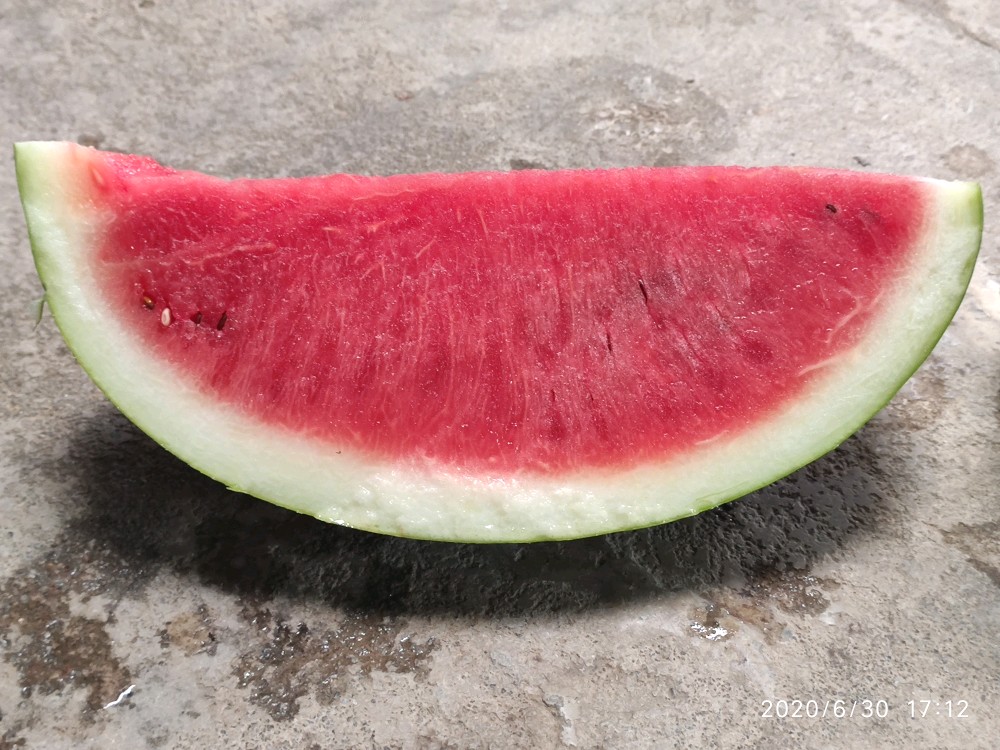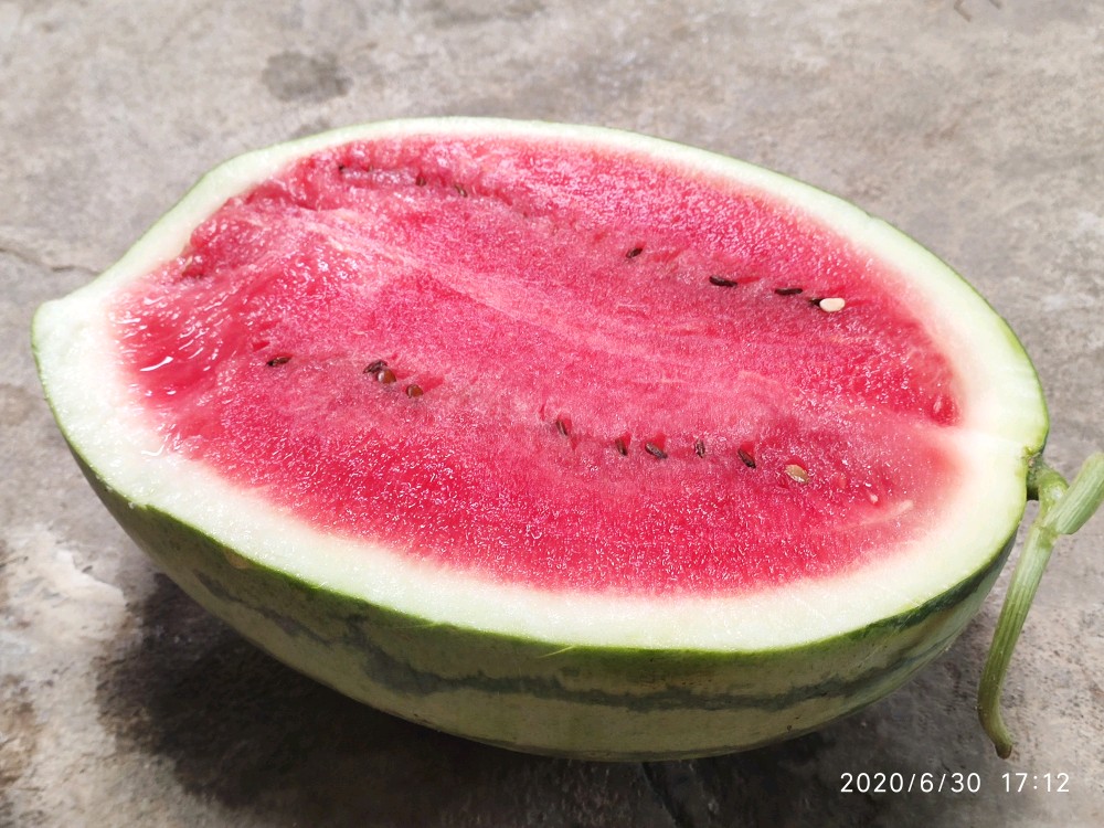 连同香瓜一起的还有俩西瓜,还有一个是前两天老妈采的。因着舅舅来访,三个西瓜又送出去了俩,自己切开一个吃,红却不是很甜。我一度怀疑这瓜苗是不是死了或者是要死了的缘故,去田里看了,并没有什么瓜苗枯萎,还是一片生机盎然