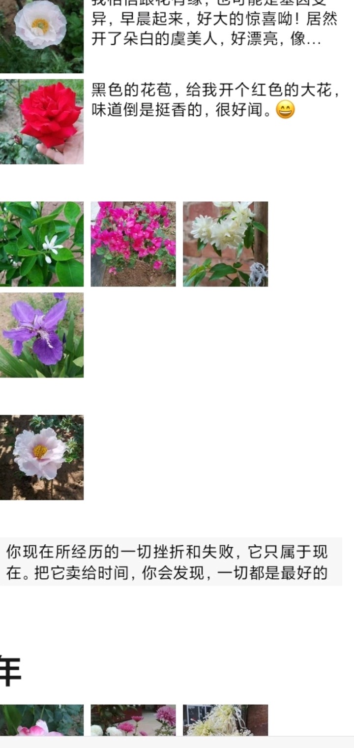 花树有:海棠、桂花、腊梅、紫藤、合欢。爬藤的有爬山虎,开着橙红色的喇叭花,一串串的在风中摇曳,还有大朵儿的紫色喇叭花,顺着一根绳爬上去,能爬到屋顶,那满藤的花朵啊!令人淘醉、赞叹、为之目醉神迷!