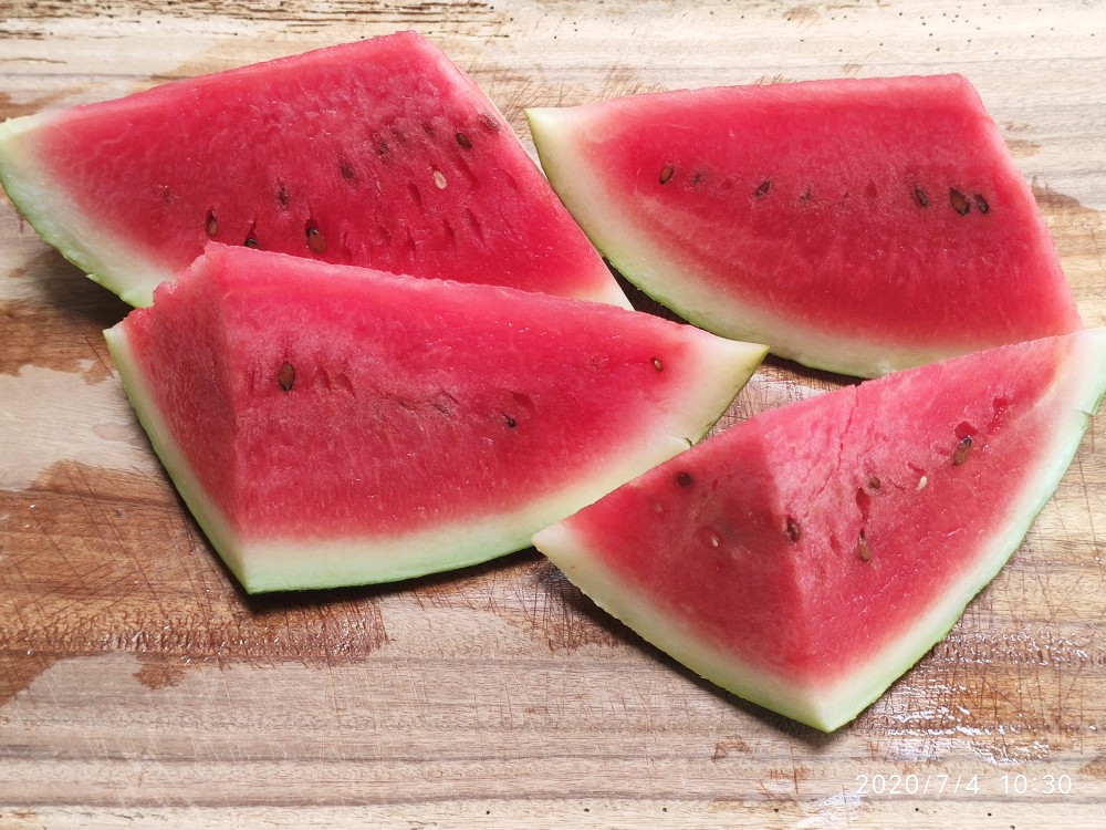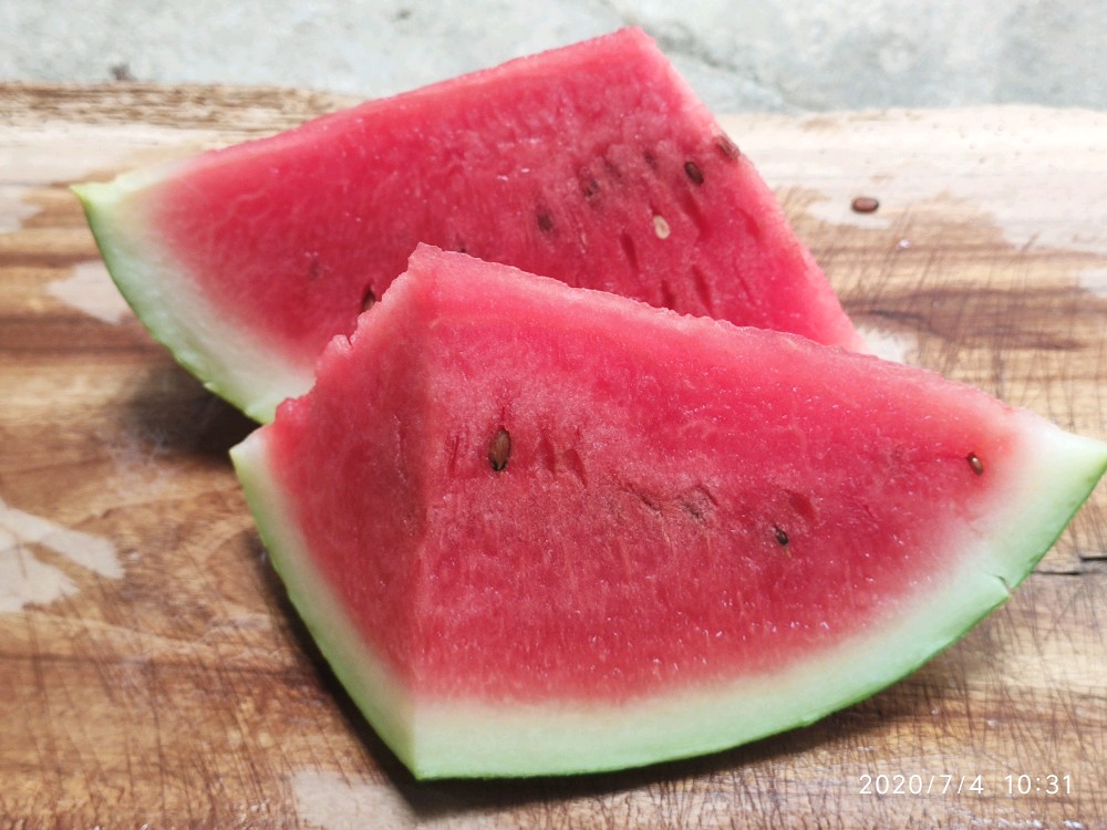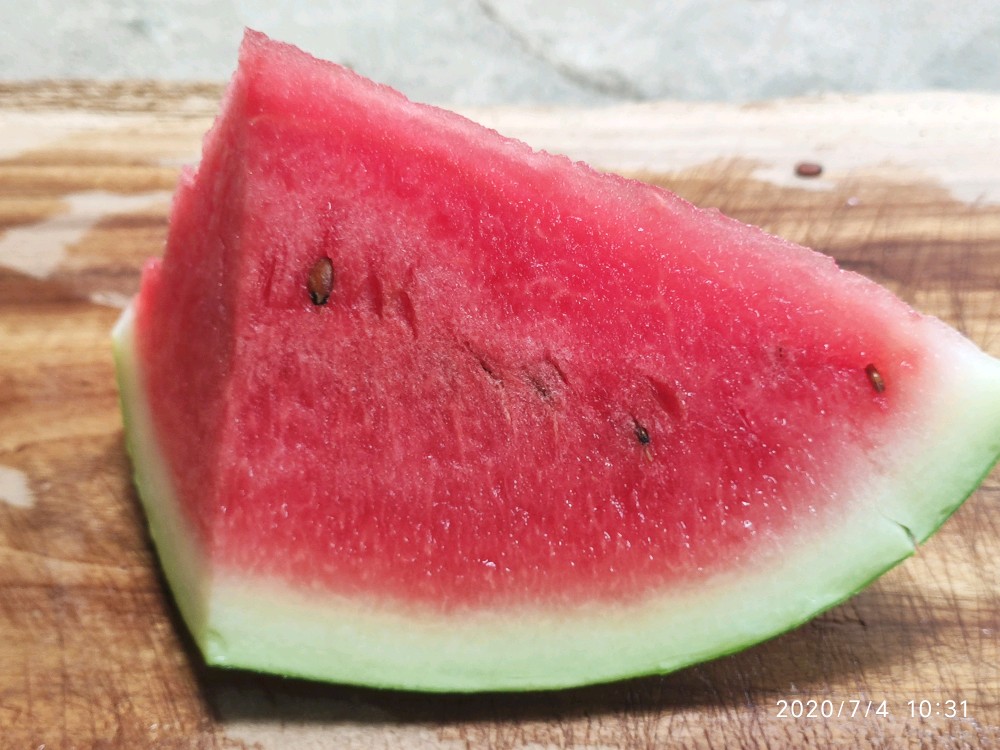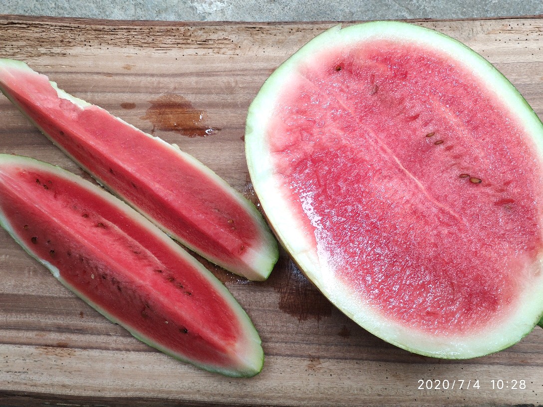 后面长出来的还没咋熟,很多天前摘了一个,里边也是感觉有点烂了。今天好容易摘了一个好瓜,刀搁在上面稍一用力,便自动裂开了。心里窃喜,这西瓜肯定好吃。