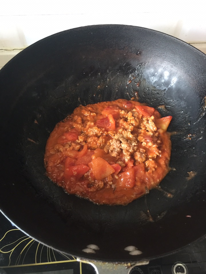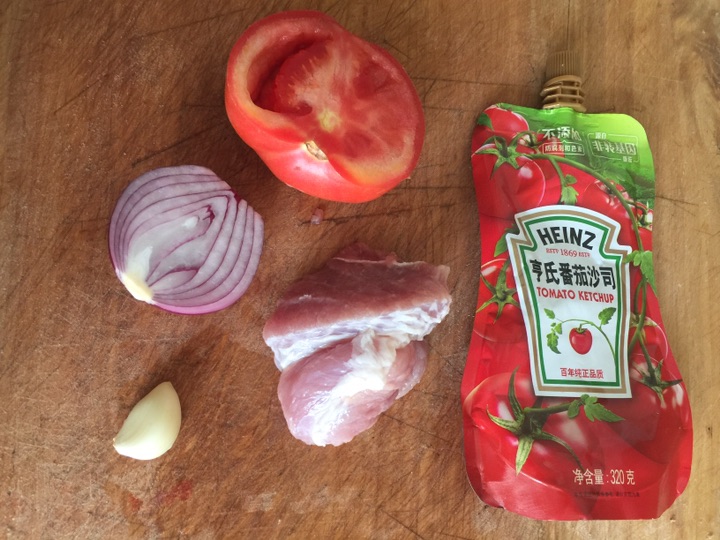 2、热锅加油,把大蒜炒香,放入肉末翻炒,再放入西红柿块和洋葱丁,加入番茄酱和牛奶(牛奶一定要少量多次的加,否则酱就会变成奶白色的,不好看也不好吃了)。