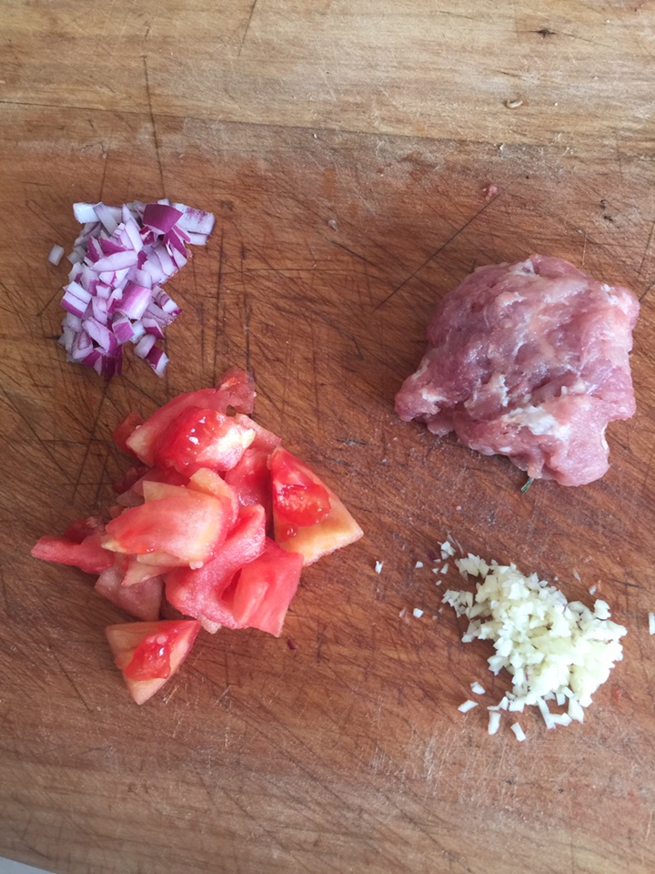 1、把肉切成肉末,把西红柿切成块,洋葱切成丁,大蒜切成末。