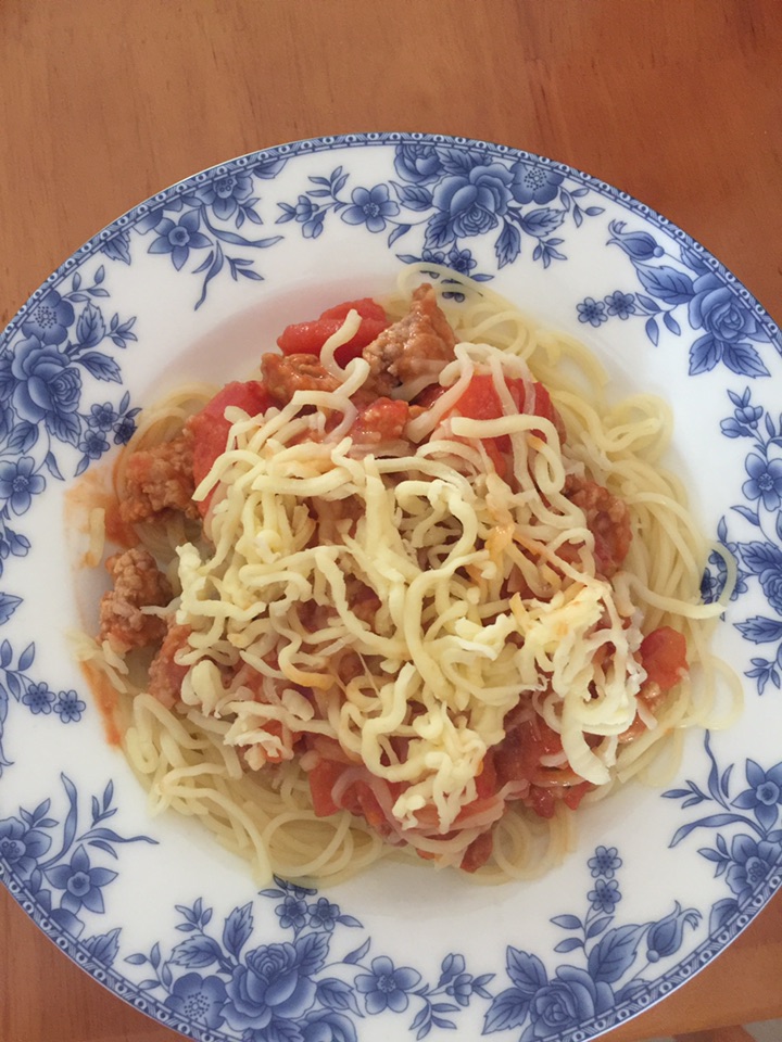 4、最后把酱汁淋在面上,再加一些芝士,就可以吃啦。