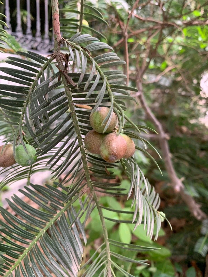 榧树,别名:???为红豆杉科榧树属植物。叶形比较细,叶长3-4cm。果实叫香榧,可以食用,但必须得炒熟。一般在饭前吃10到15粒,进食过多会不好,因为它会有一点毒性,所以尽量少食。
