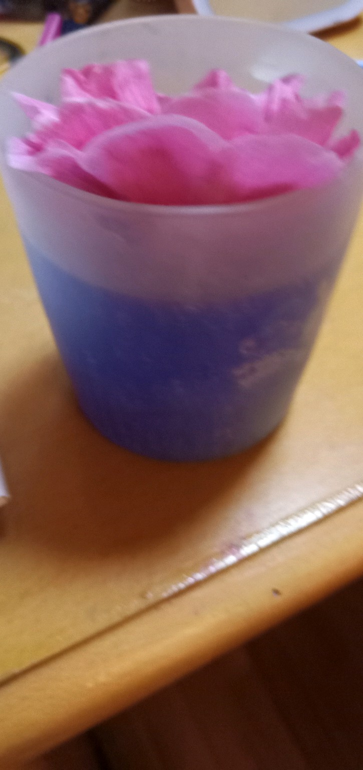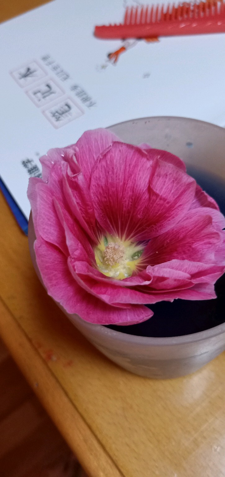 然后把一朵粉色的蜀葵放进去,等到明天再看看会不会变成紫色或黑色。