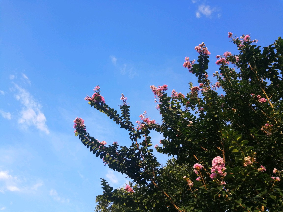 但 最让人惊艳还是那一树树的紫薇花,现在公交站旁等车的空隙,太阳光十分毒辣,抬头看看一树紫薇摇曳在这蓝天白云下,那一瞬间觉得这世间真的很美丽,足以让人倾心。