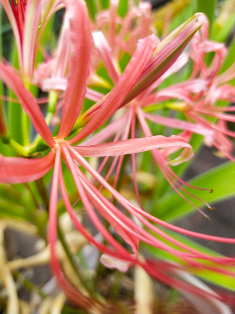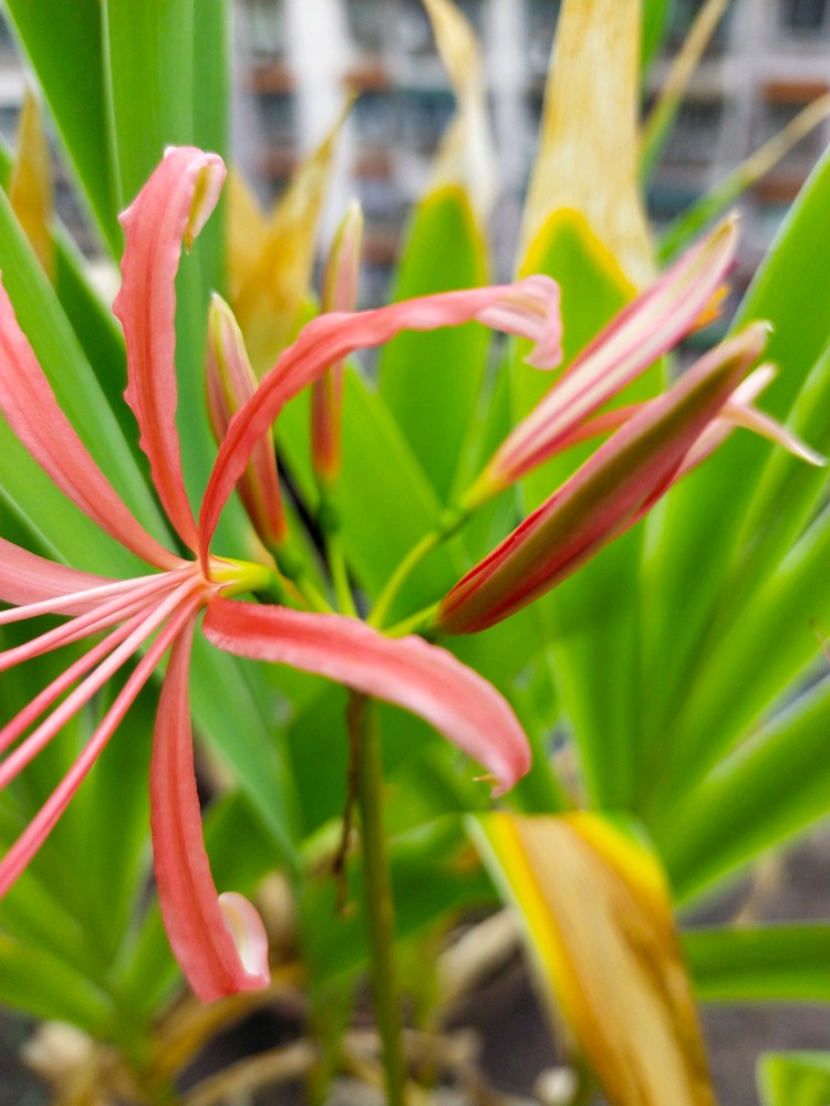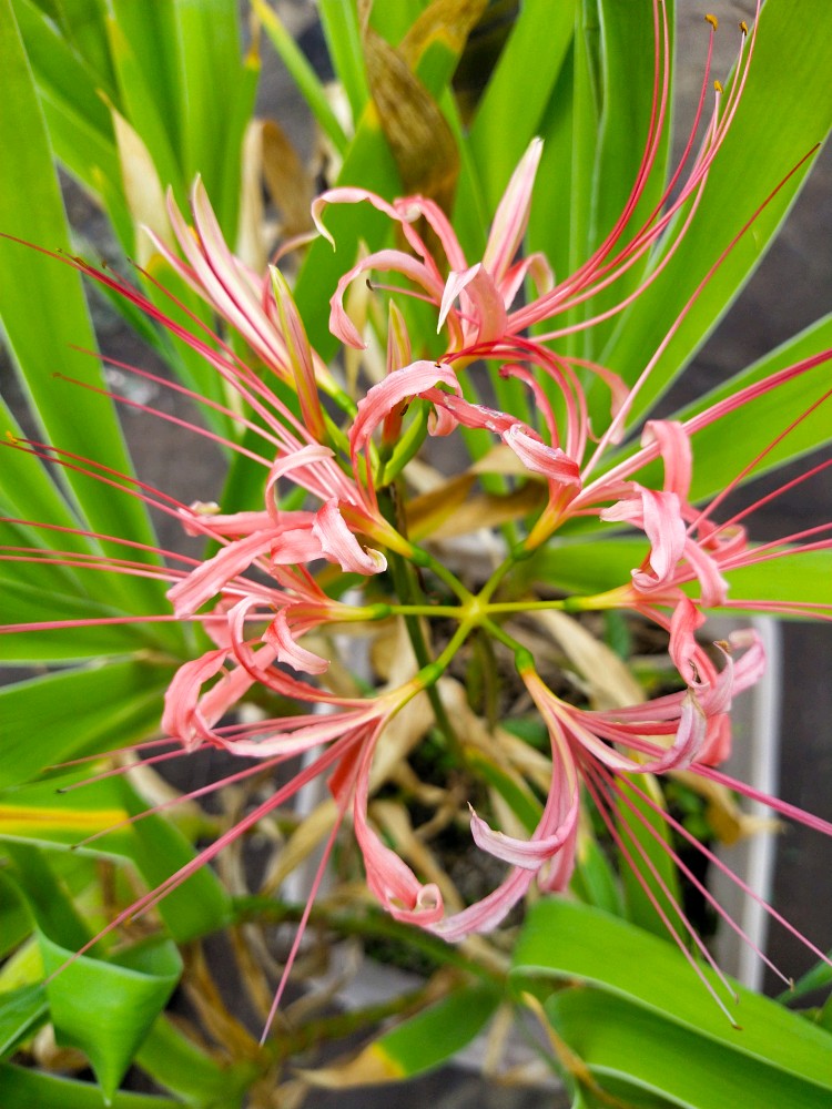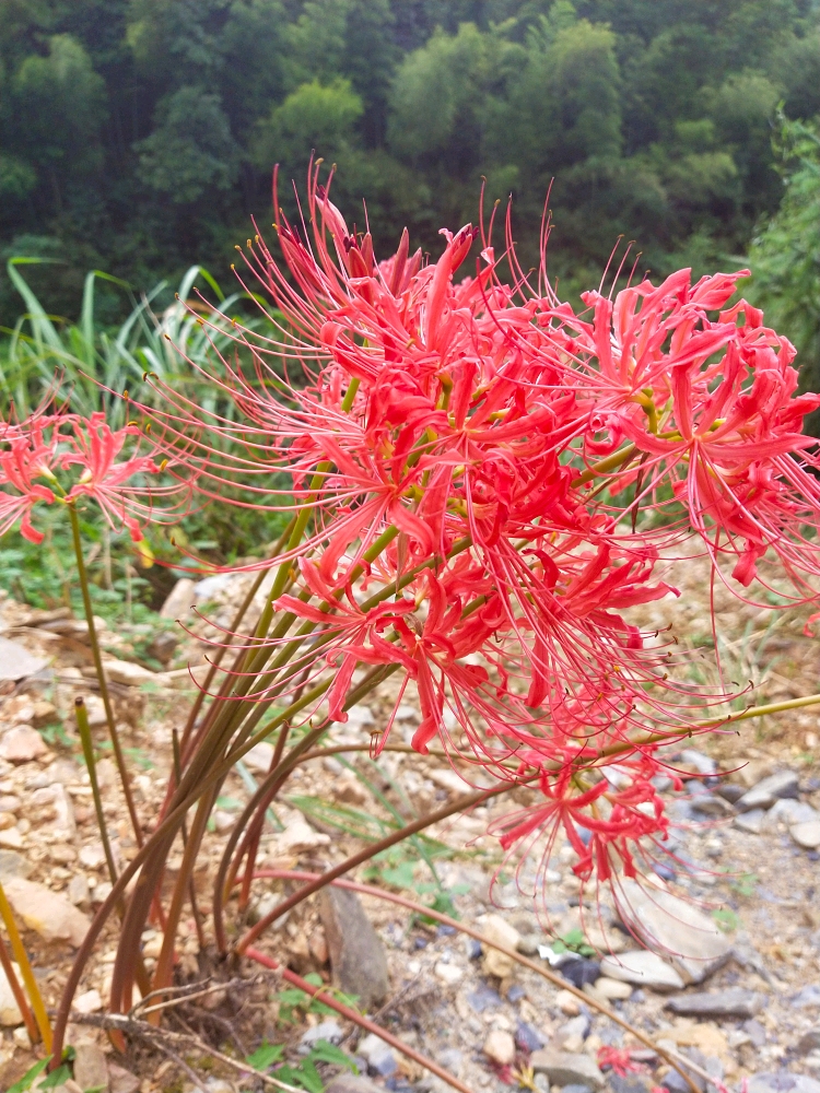 被我丢在楼顶的射干丛中开出两朵艳丽的彼岸花。记得小时候家后山凹里有很多,只知道是石蒜,老爸说那个有毒,要我别拿来玩,很可惜记忆里没观察过花。