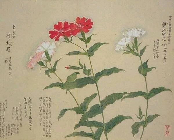 七月:葵倾日。玉簪搔头。紫薇浸月。木槿朝荣。蓼花红。菱花乃实。