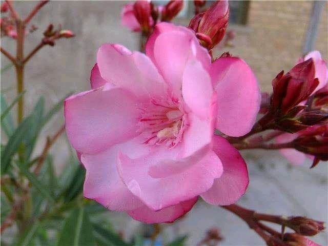 夹竹桃(学名:Nerium oleander L.)夹竹桃族夹竹桃属常绿直立大灌木,高可达5米,枝条灰绿色,嫩枝条具棱,被微毛,老时毛脱落。叶3-4枚轮生,叶面深绿,叶背浅绿色,中脉在叶面陷入,叶柄扁平,聚伞花序顶生,花冠深红色或粉红色,花冠为单瓣呈5裂时,其花冠为漏斗状,种子长圆形,花期几乎全年,夏秋为最盛;果期一般在冬春季,栽培很少结果。