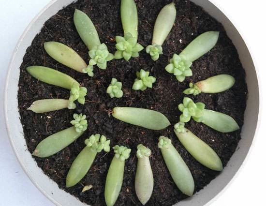 接着把多肉叶片一片片摆好到盆土上,为了使多肉快速生根,我们可以使用稀释800倍的有机营养液做定根水,一次浇透,这样比较利于快速生根,抽新芽。